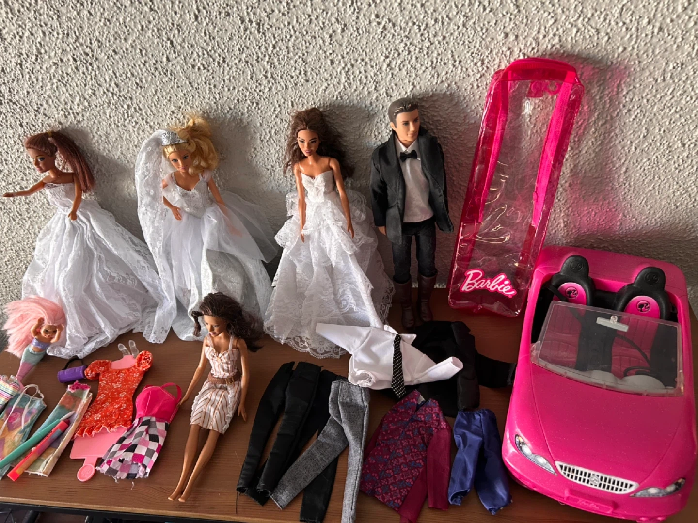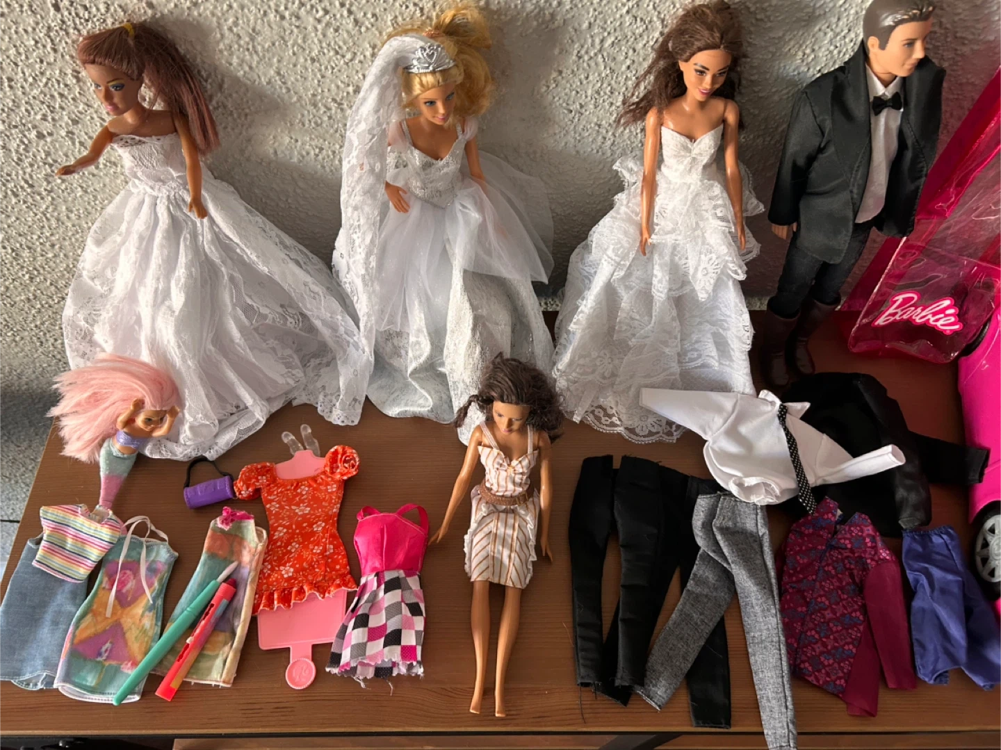 • Clothing & Accessories: Assortment of extra outfits, including dresses, skirts, pants, a formal suit for Ken, and small accessories.