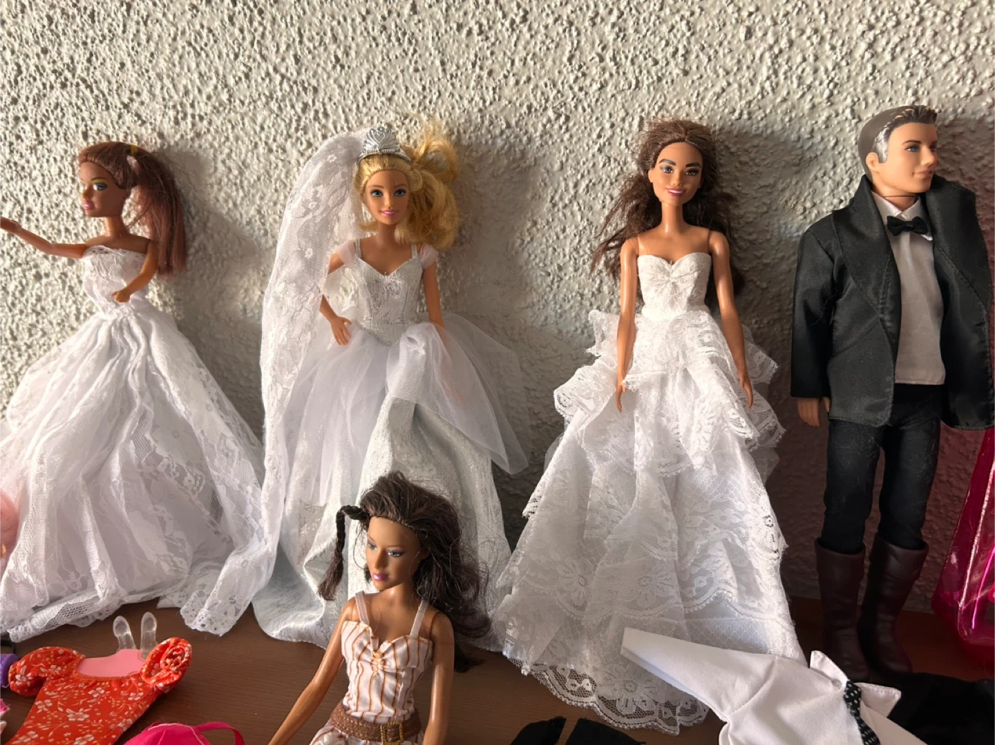 Three Barbie brides in detailed lace gowns and tiaras, plus one Ken doll in a formal black tuxedo.