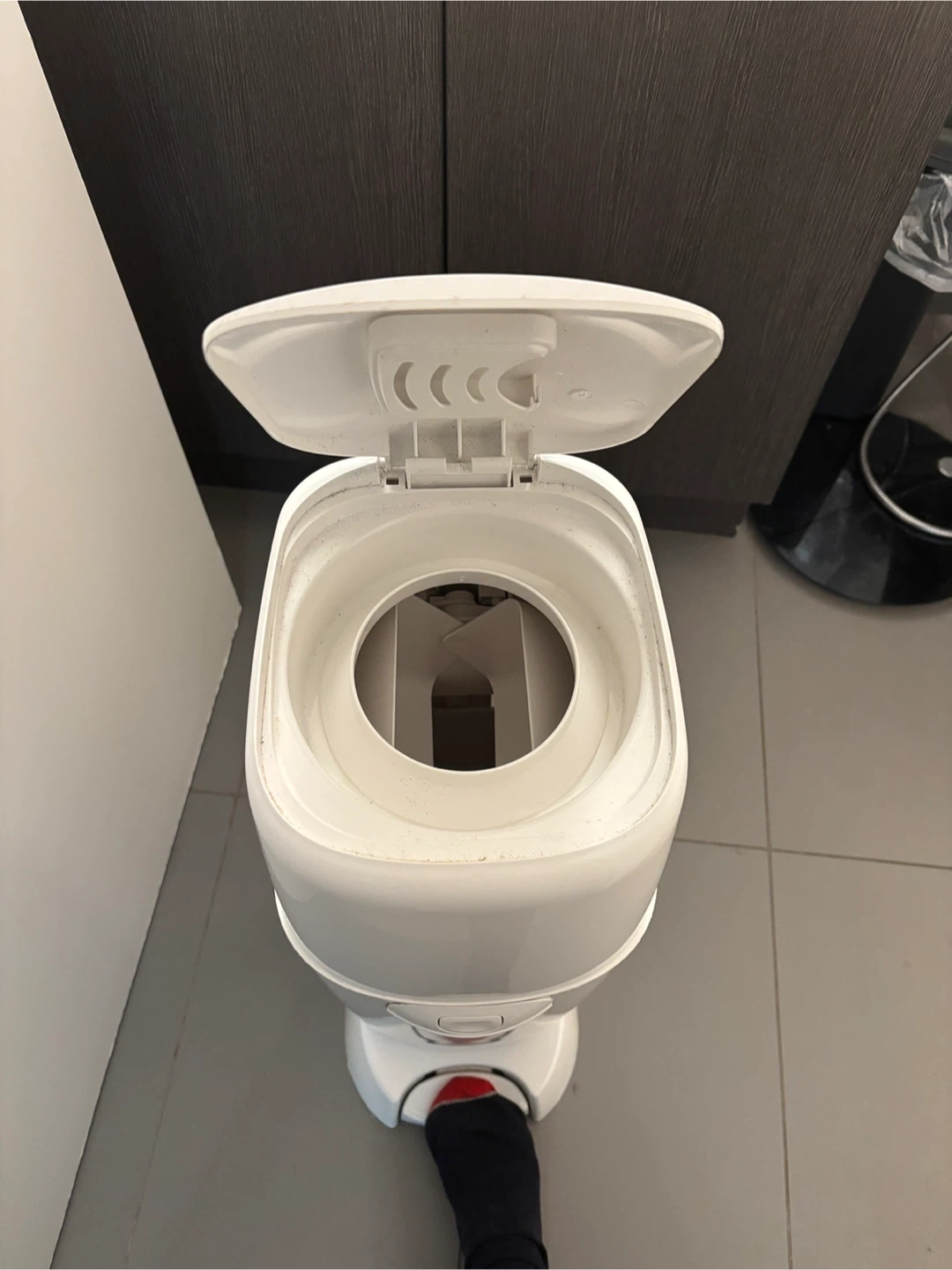 This white Diaper Genie Complete diaper pail helps control odours. It's made of durable plastic and features a foot pedal for hands-free operation. The multi-layer bag system traps smells effectively.