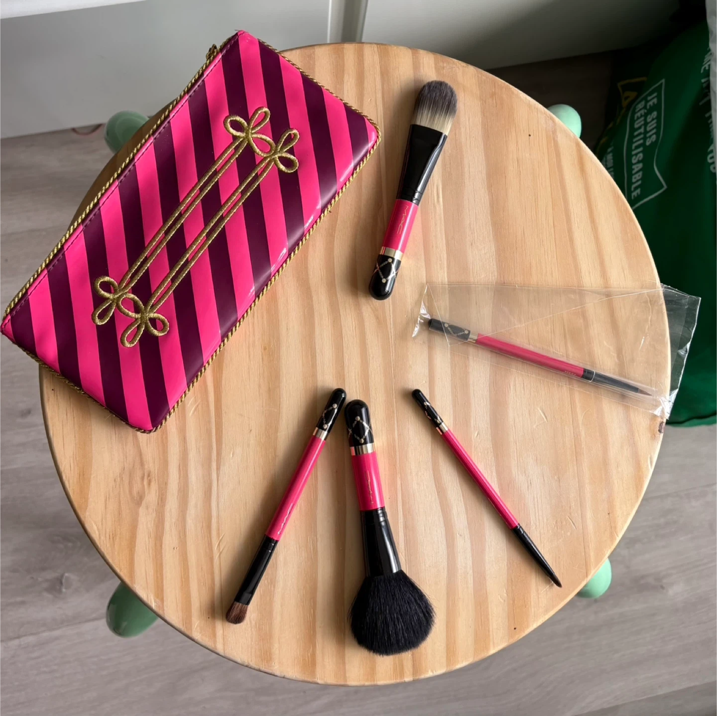 This is a MAC Cosmetics makeup brush set. It was limited edition Christmas launch that came out in 2016. It includes a zippered pouch and five brushes. The brushes have pink and black handles with gold accents. Some have been very lightly used, as in once or twice, but have been cleaned after use.