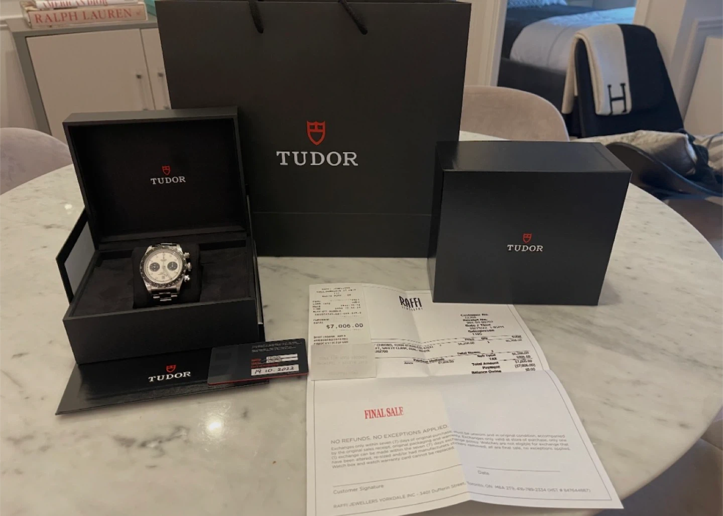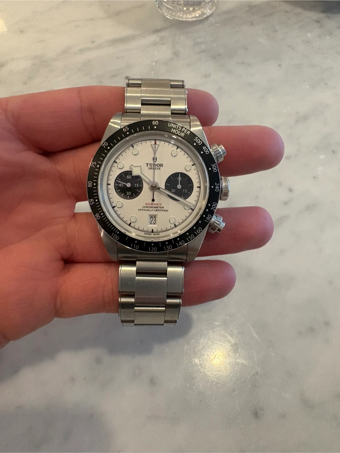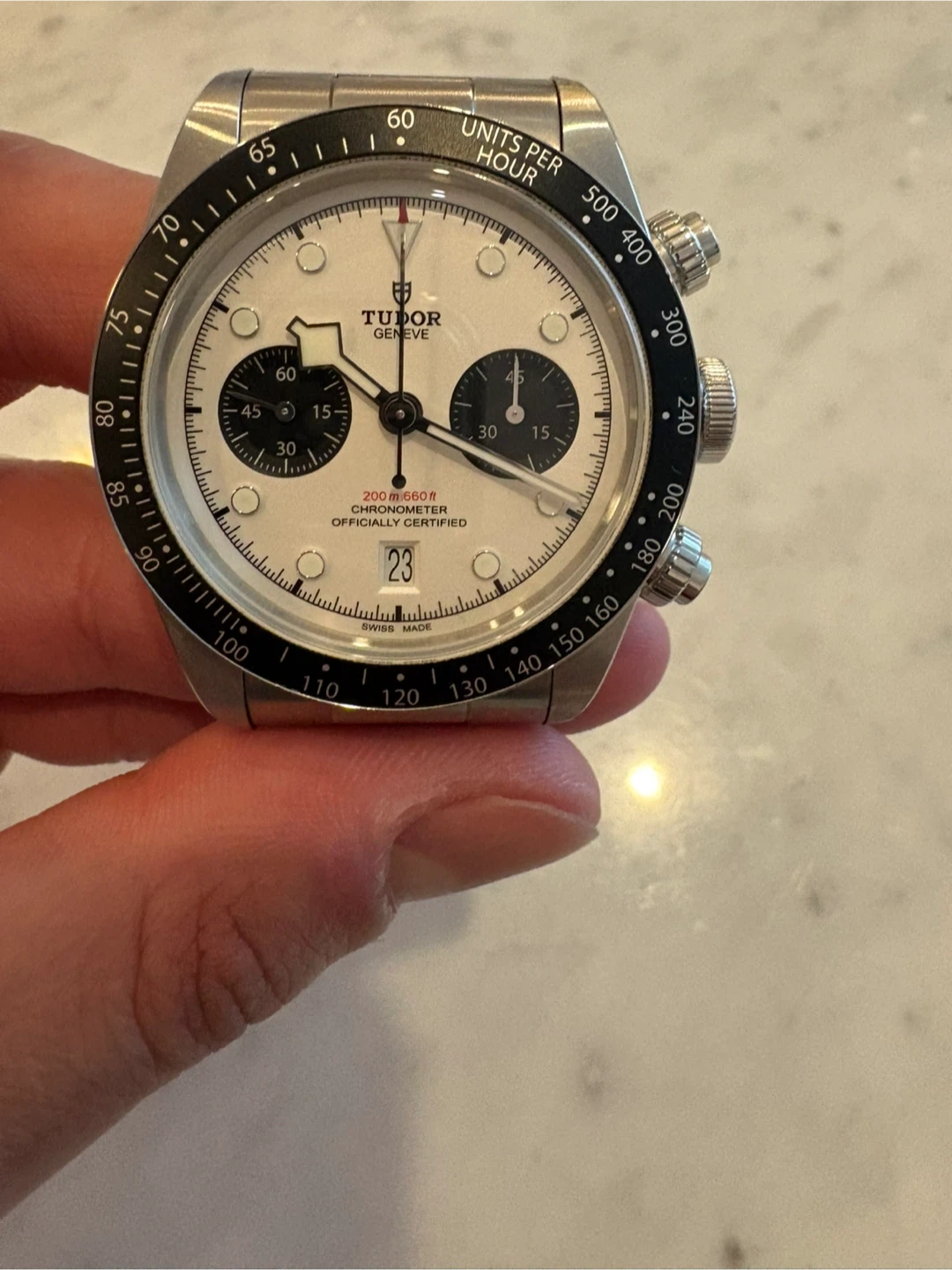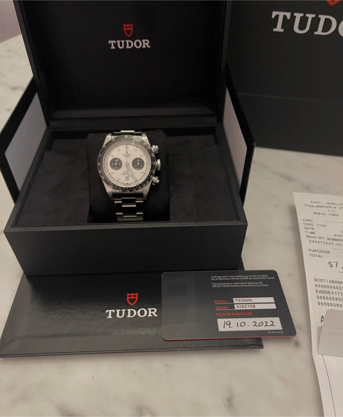 Selling my Tudor Black Bay Chrono (reference 79360N-0002) with the white “Panda” dial on stainless steel bracelet. The watch is in excellent condition with only light wear from normal use. Bezel and crystal are perfect. Purchased new from an authorized dealer in 2022. Comes as a full set — box, papers, warranty card, and all links. Current retail price: $7,125 + HST (≈$8,050 total) Asking price: $7,000 firm For safety and peace of mind, I’m happy to meet at a police station, bank, or local jeweller for authentication and inspection if desired. No trades. Serious inquiries only.