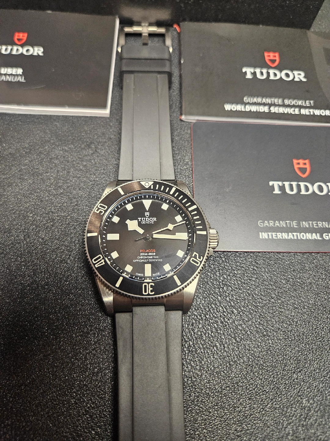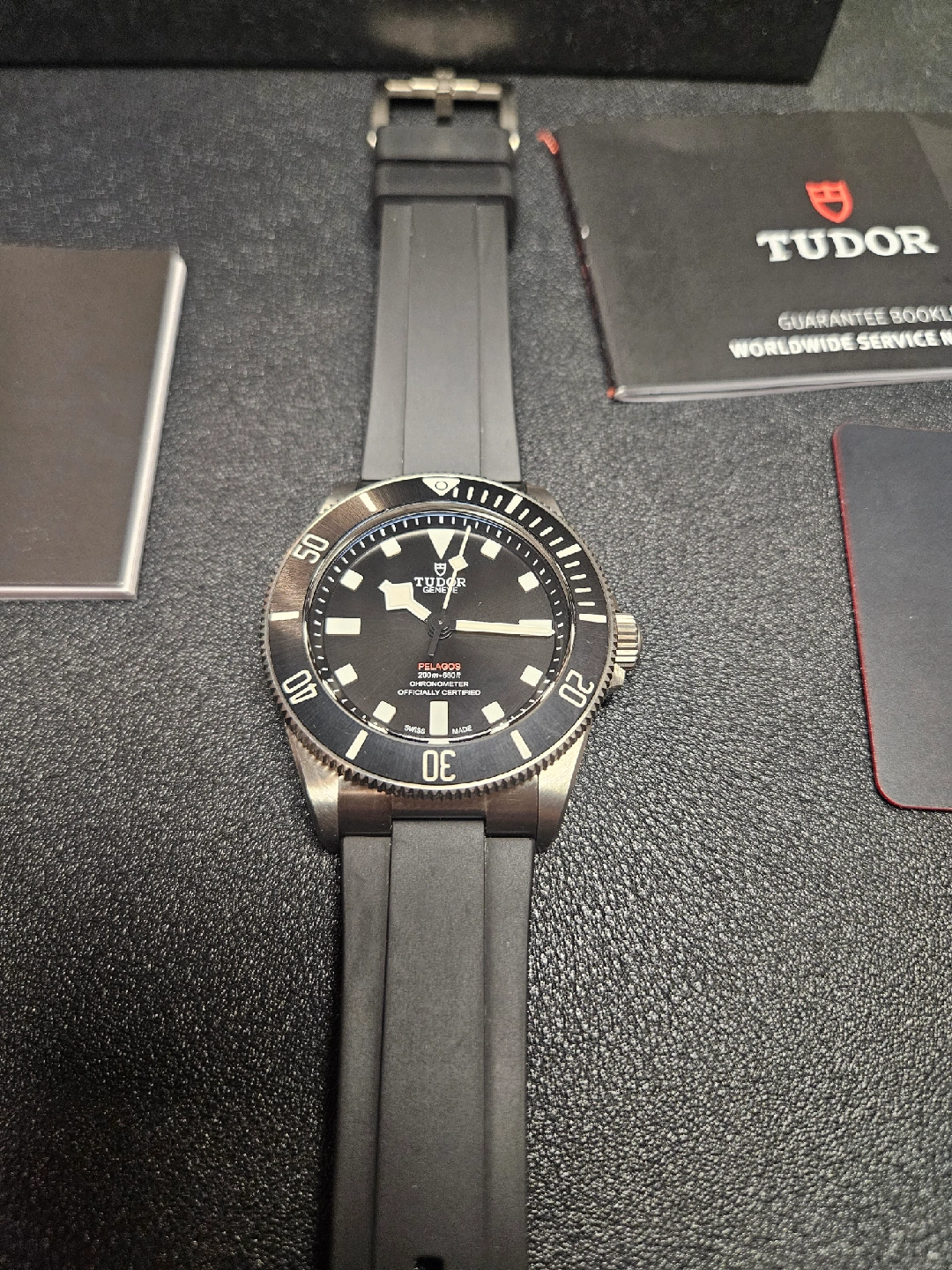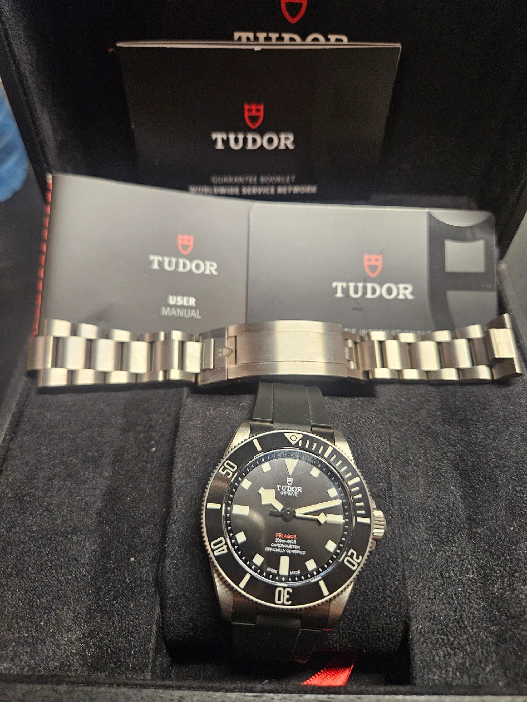 Selling my Tudor Pelagos 39 (Ref: M25407n-0001) in very good condition. Including: Box, Papers, warranty card, instruction manual booklet, Tudor titanium bracelet and Tudor rubber strap. The watch in is excellent condition with some minor hair line scratches ( all of the scratches can be see in the picture) . Tudor Pelagos 39 is one of the best everyday watch that can dress up or down depending on where you go. The Tudor Pelagos 39 also won the Best Sports Watch award at the 2023 Grand Prix d'Horlogerie de Genève. Warranty active until end of 2027. Prefer face-to-face meetings in the GTA or Kitchener/Waterloo area. I am also happy to meet at any Tudor Authorized Dealers or any Watchmaker at your choice. Retail price is over $7,100 I am asking: $4550 for a mint condition watch with warranty active until end of 2027.
