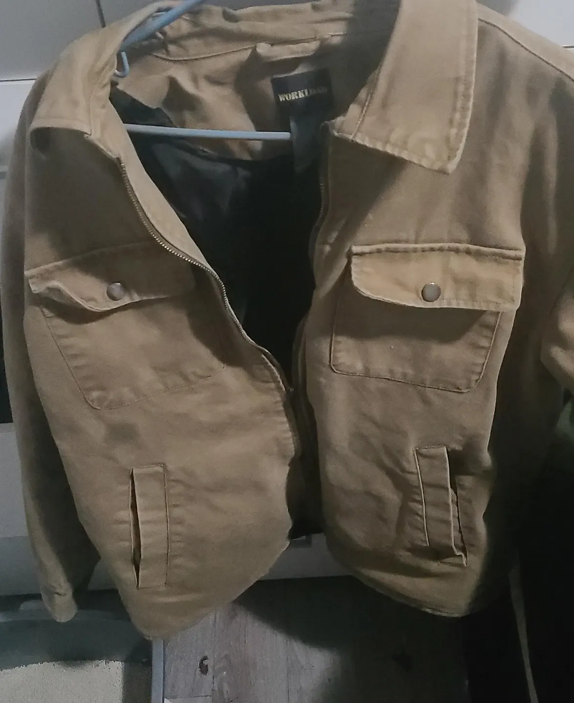 Tan Workman jacket with zip closure and chest pockets. It's a sturdy outerwear piece. This jacket is great for everyday wear.
