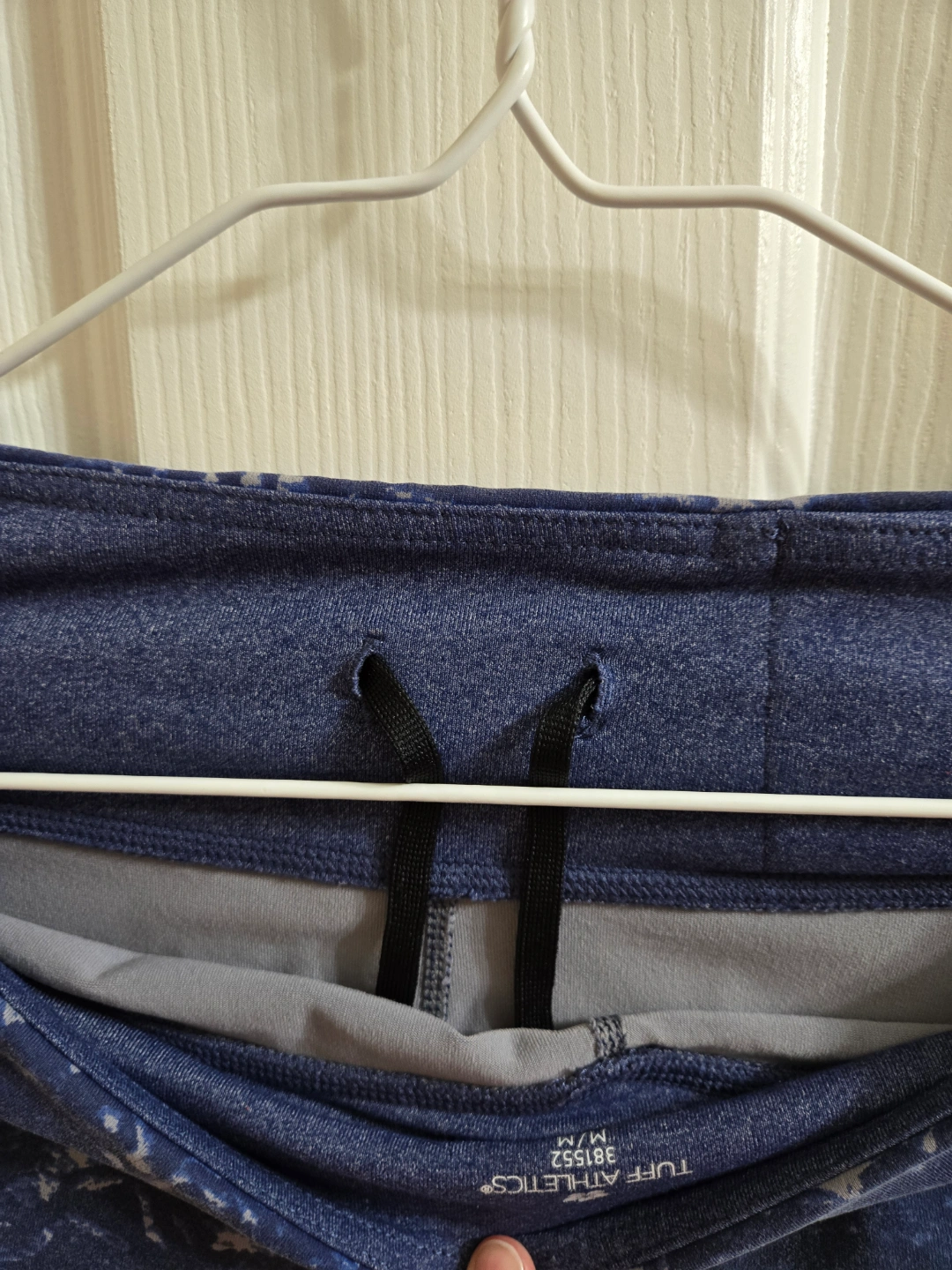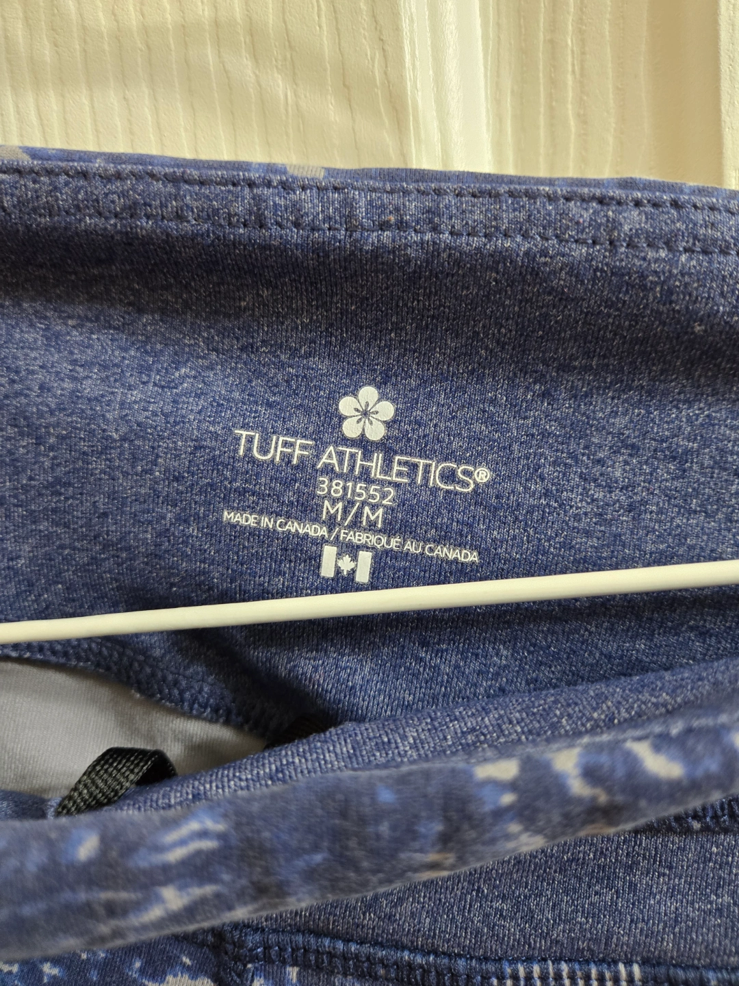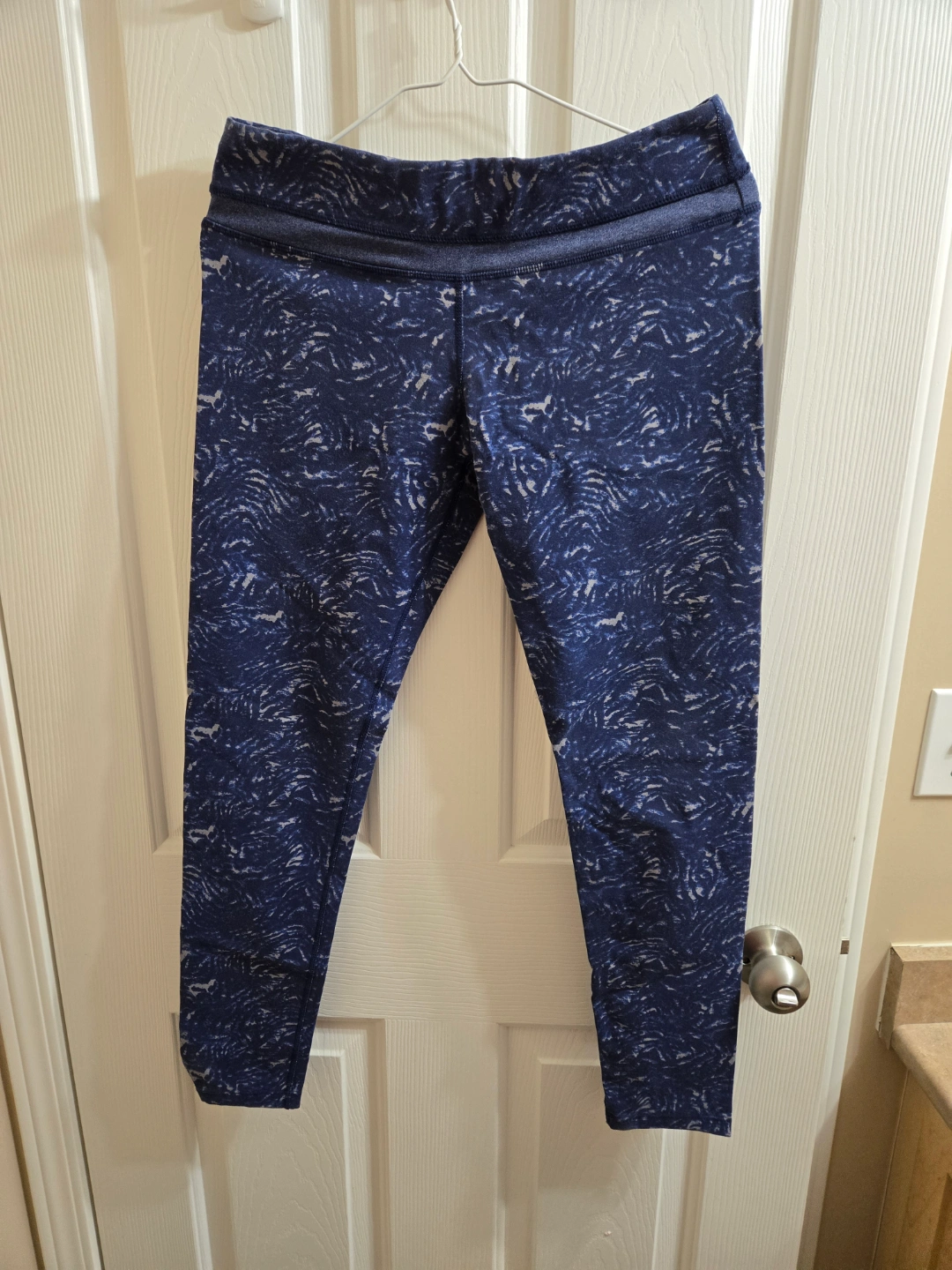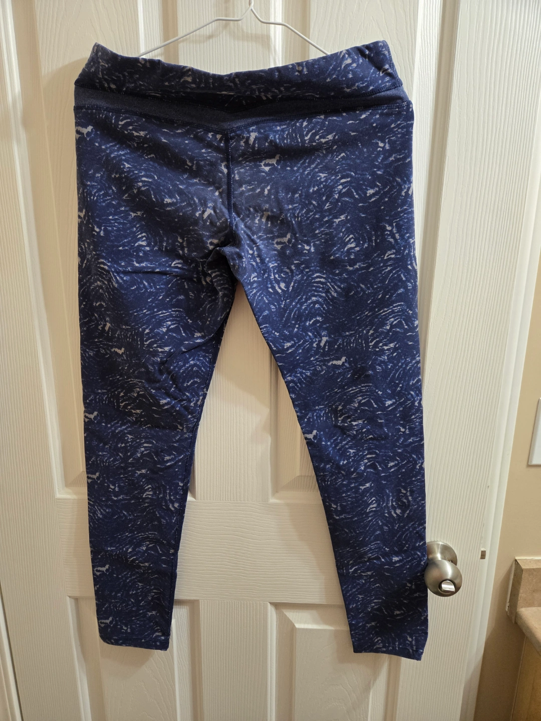 Women's size medium navy blue and white patterned leggings. Made in Canada. Drawstring waistband.