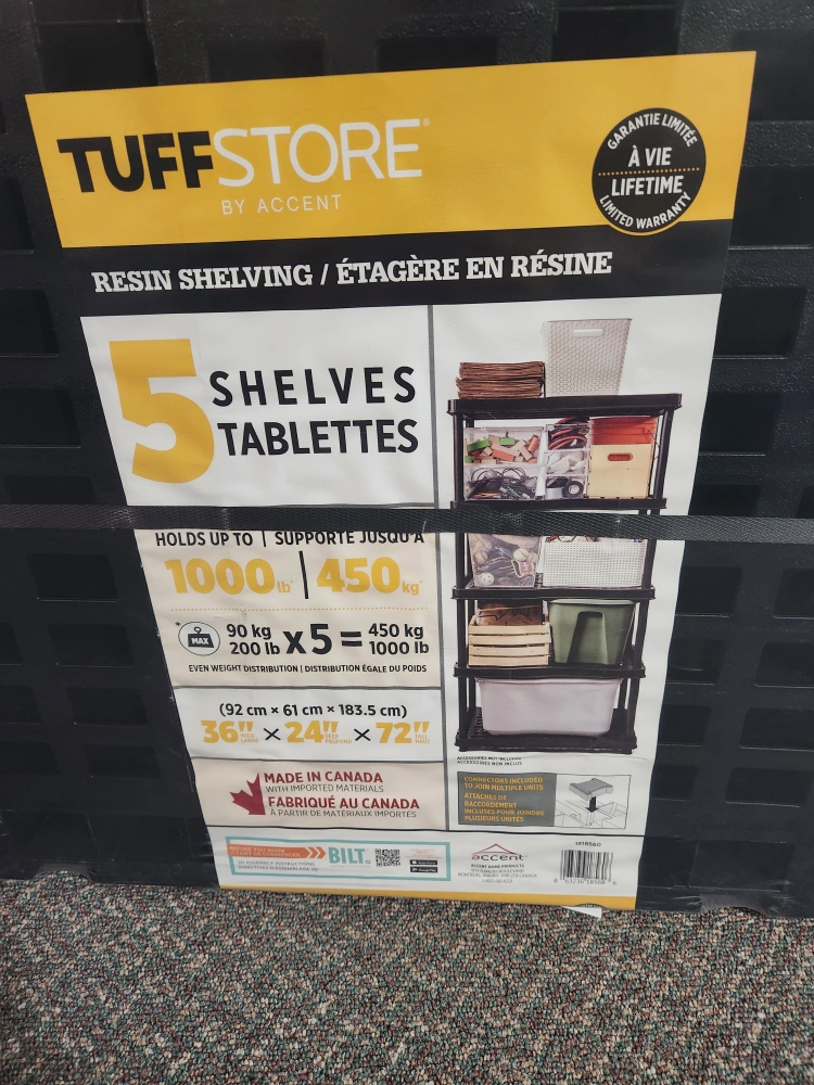I have a brand new, still in the box, Tuff Store 5-shelf resin shelving unit. It's black and measures 36" x 24" x 72". Each shelf can hold up to 200 lbs (90 kg), with a total capacity of 1000 lbs (450 kg) when evenly distributed. Made in Canada!