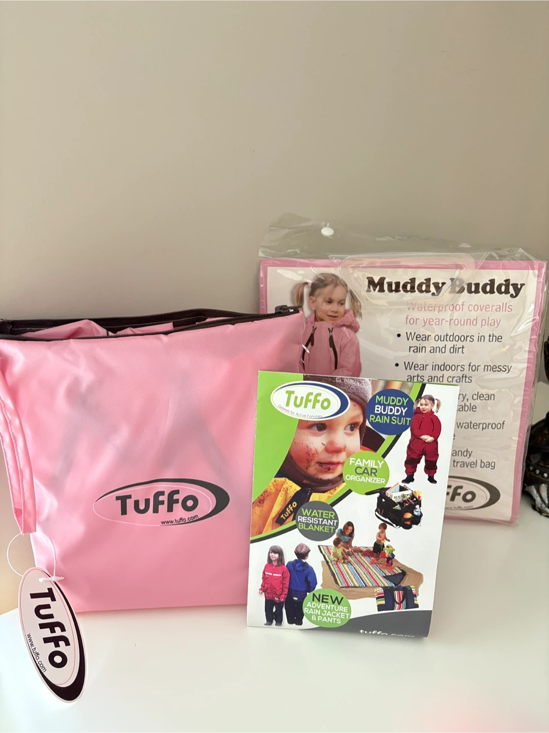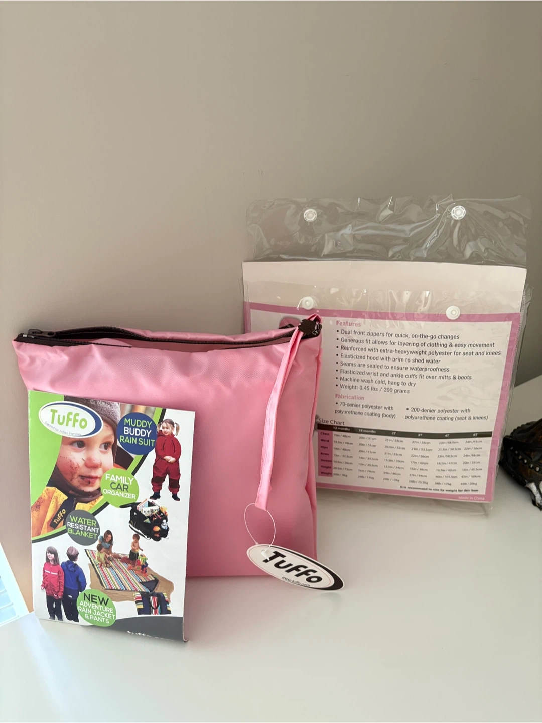 20New with tag, never been worn. Tuffo Muddy Buddy rain waterproof coverall. Size : 2T. It's lightweight, waterproof, and durable, perfect for messy arts and crafts or outdoor play in the rain and dirt. Comes with a handy waterproof travel bag for easy storage and transport. Muddy Buddy is a popular and trustworthy brand. Most welcome by daycare centre.
