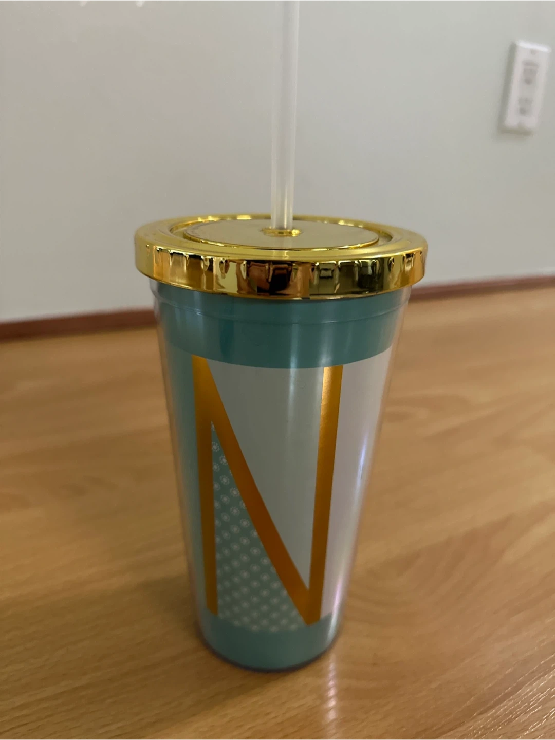 Selling a cute tumbler with the letter N on it! It comes with a straw and has a unique design with a gold-coloured lid. Perfect for keeping your drinks cold on the go. Brand new.
