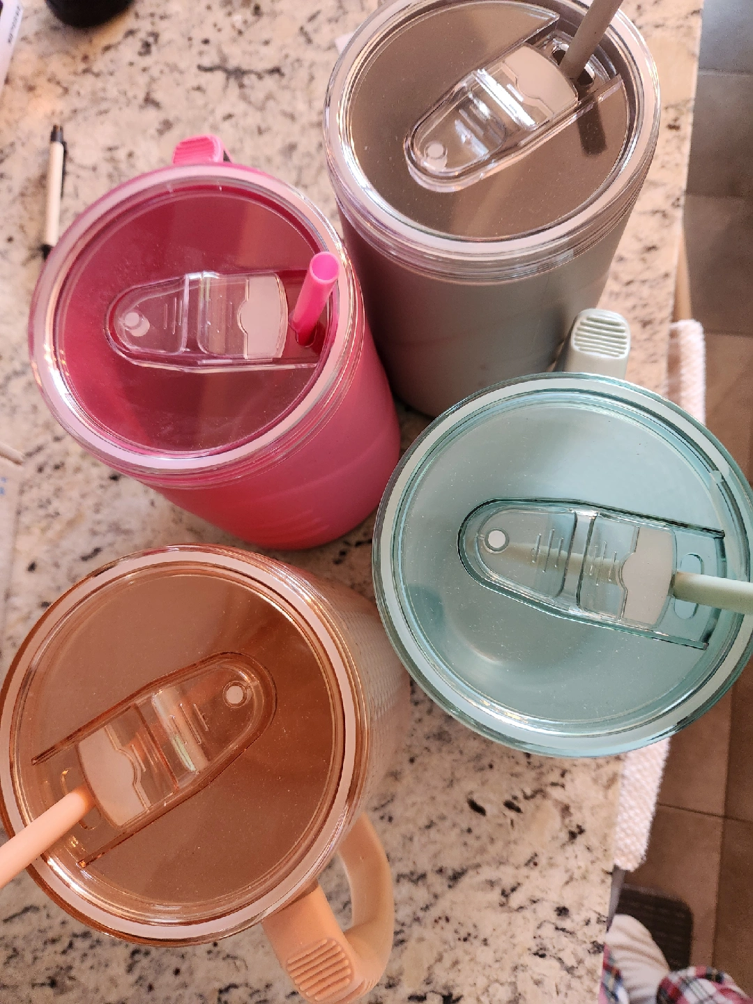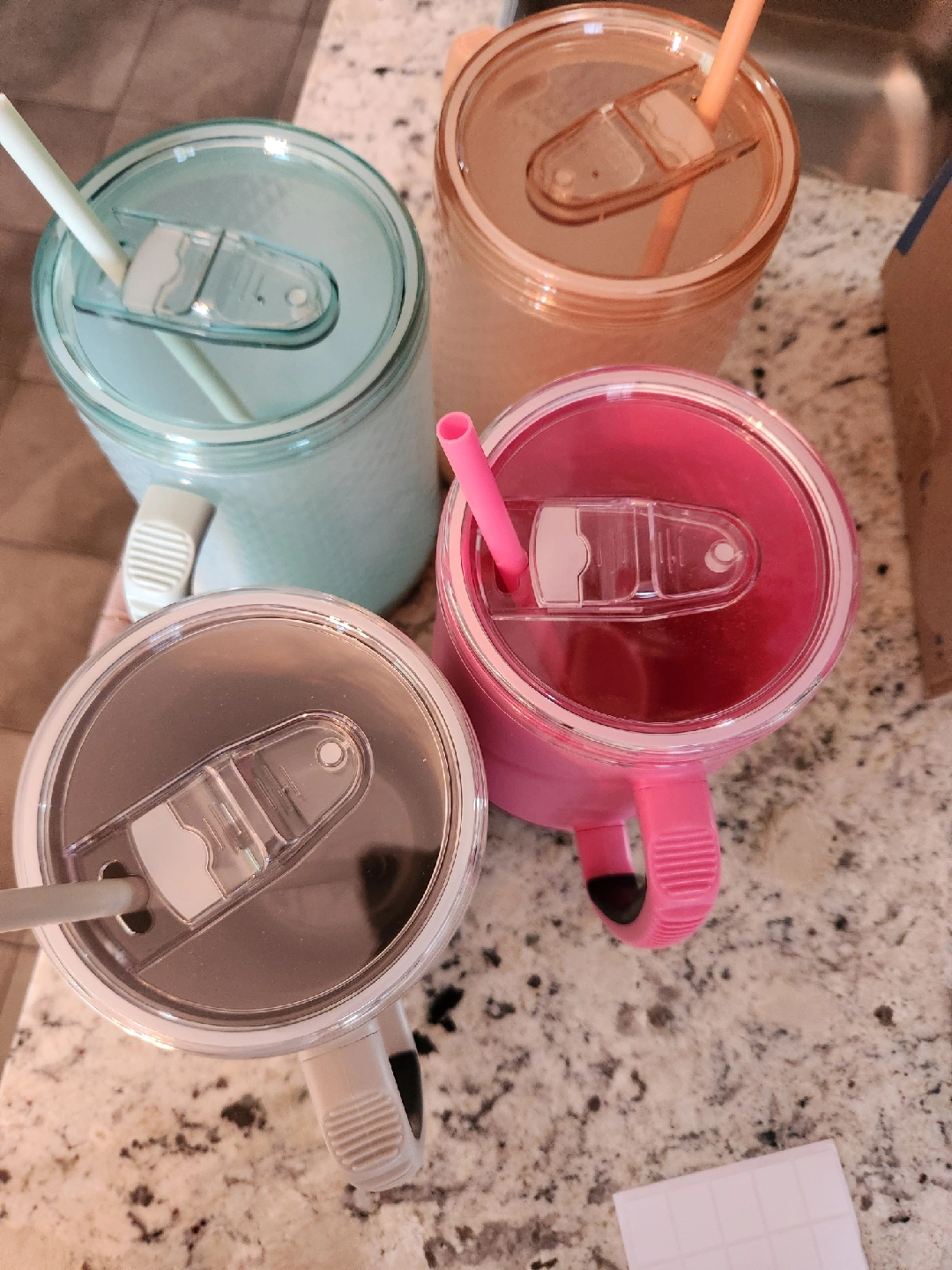 15Selling a set of four tumblers, each with a straw and handle. They come in a variety of colours: light blue, peach, pink, and grey. Perfect for keeping your drinks cold on the go!