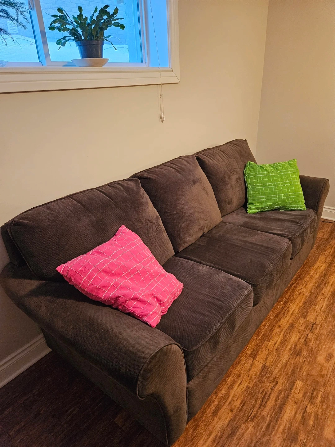 A very comfortable dark brown sofa with three seat cushions and three back cushions. The material is a soft fabric. It is in excellent condition.