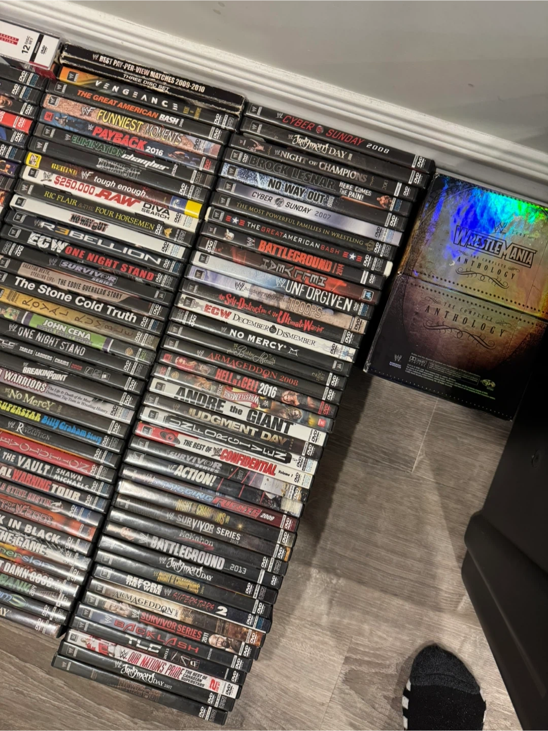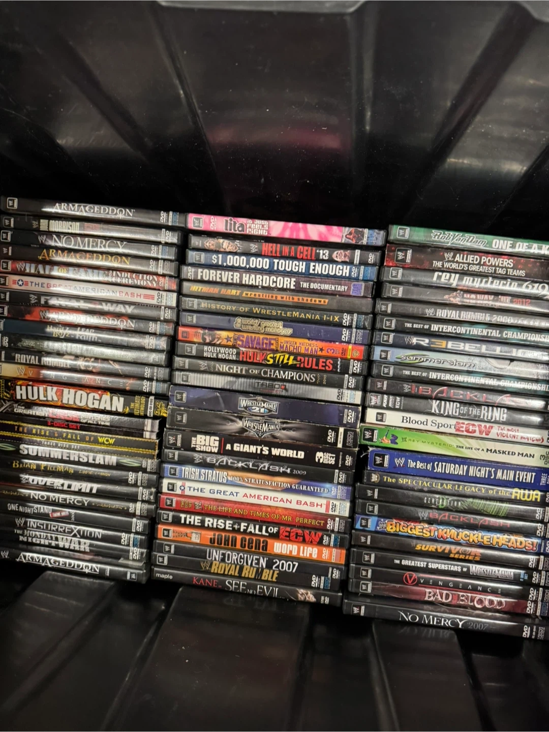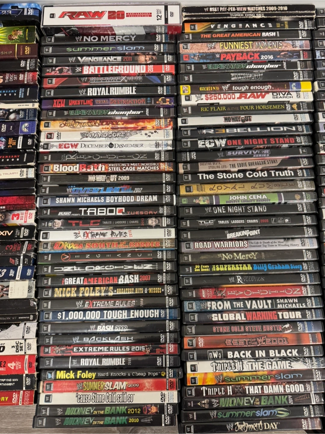 Huge lot of wwe wrestling DVDs including tnas and all lots of great valuable titles here. Selling as a lot $1500 or best reasonable offer please do some research on what is here before coming at me with a lowball. There is easily double the value of my asking here