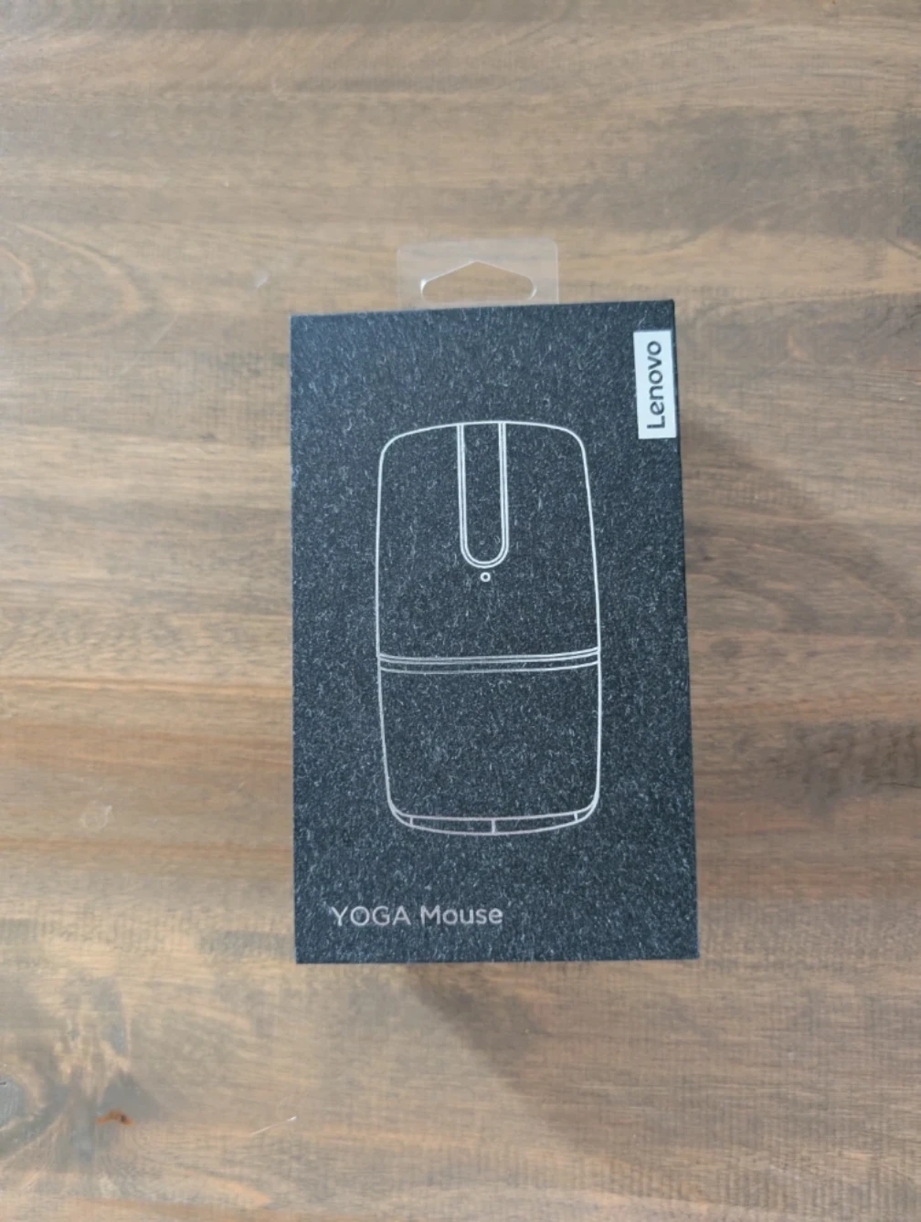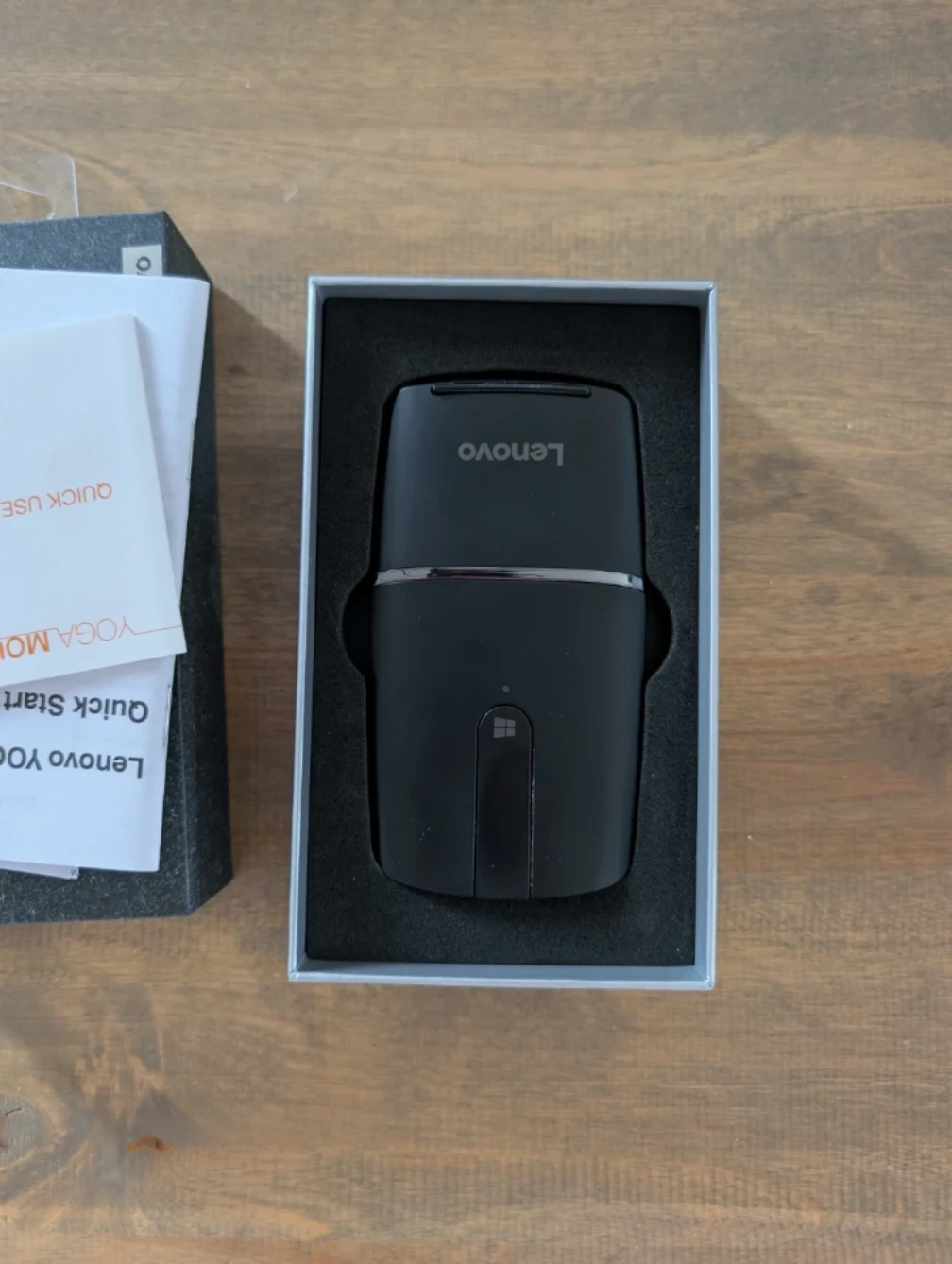 This is a Lenovo YOGA Mouse. It's black and comes in its original box with quick start guides. Perfect for on-the-go productivity!