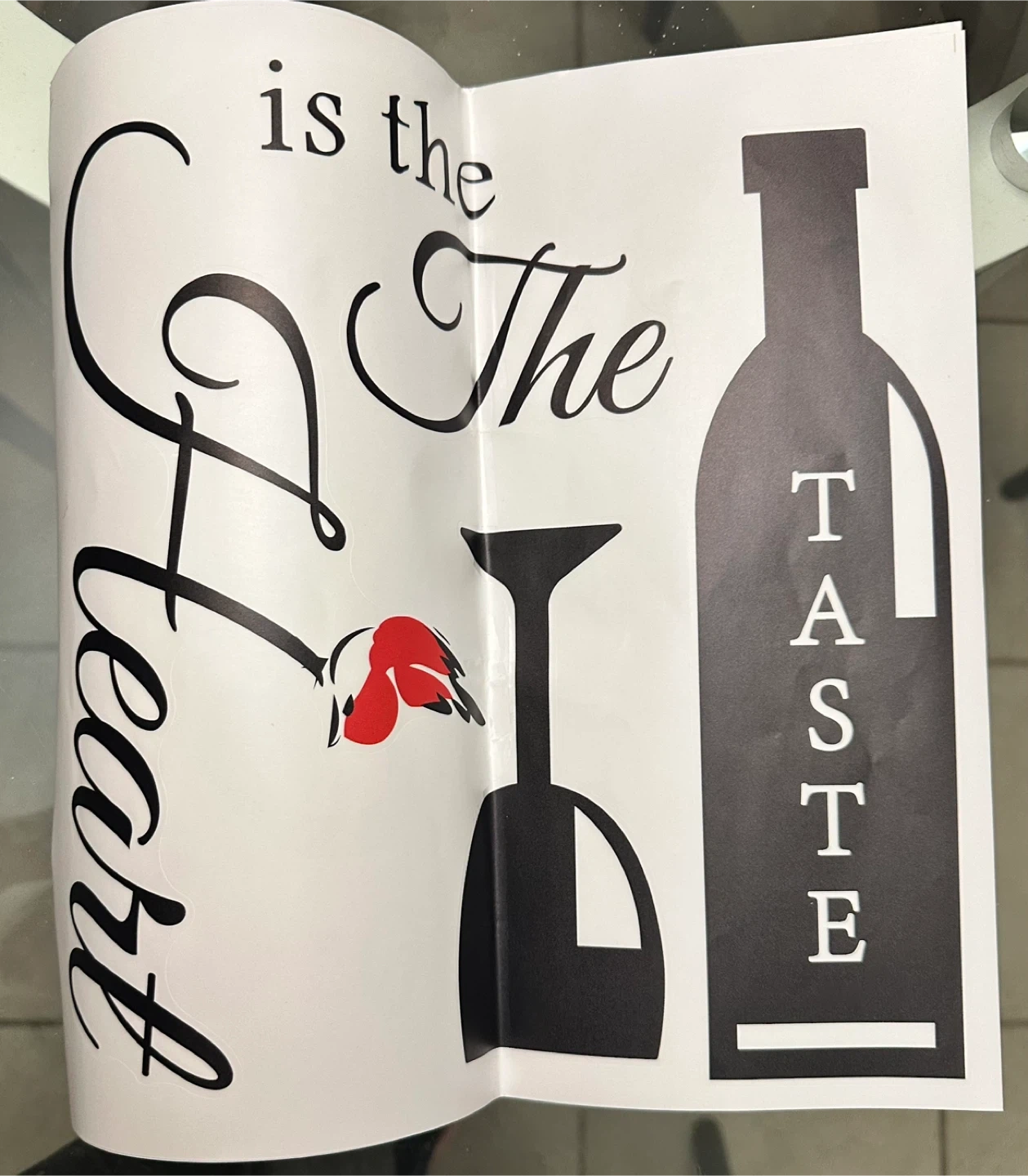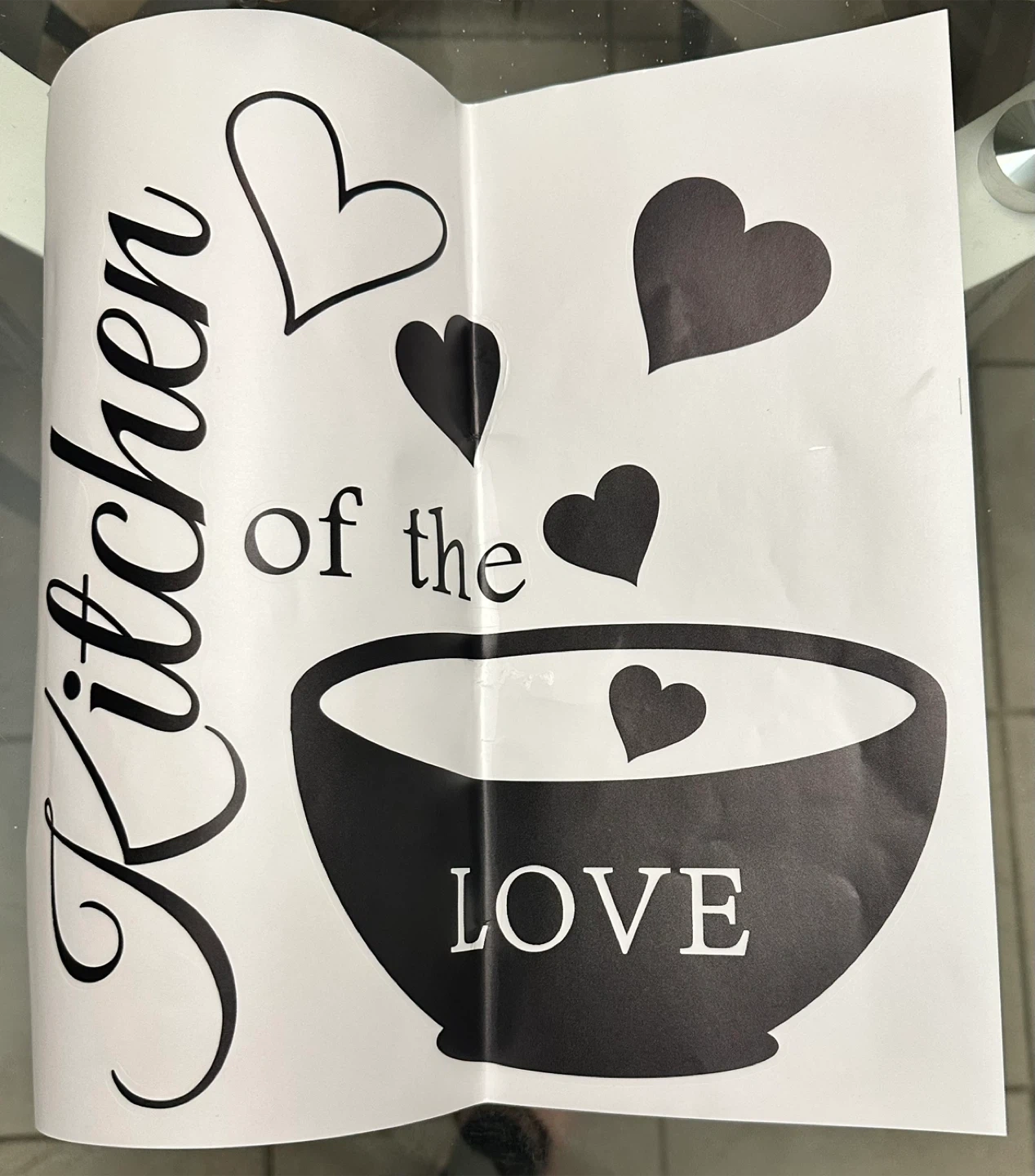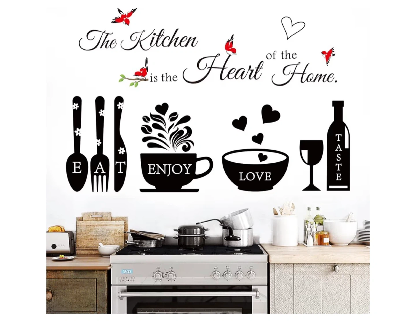 This kitchen wall decal set includes a variety of decorative elements. It features text like "Enjoy", "Love", "Taste", and "Home", along with graphics of cups, bowls, wine bottles, and cutlery. The main phrase reads "The Kitchen is the Heart of the Home". The decals are made from vinyl material and are designed for easy application to walls.