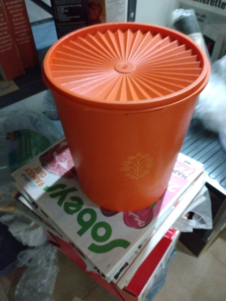 16Selling a vintage Tupperware canister in a vibrant orange colour. It's in great shape and perfect for storing dry goods or other items. A classic piece for your kitchen.