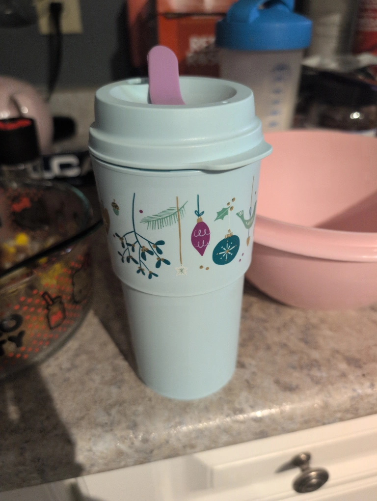 Reusable holiday-themed tumbler. Features a light blue body with festive design. Includes a matching lid