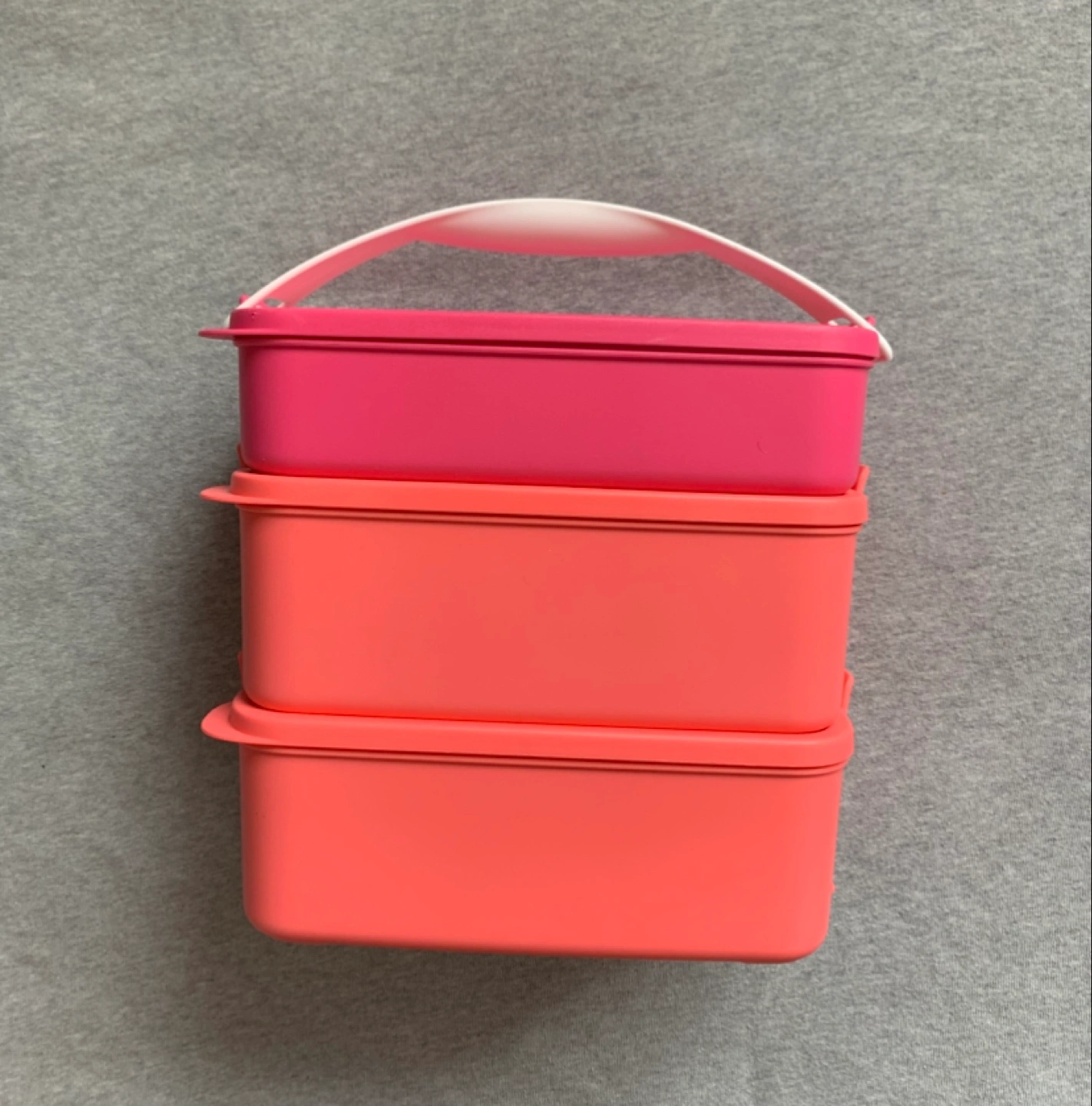 1000+Click To Go Stackable Pack N Carry Includes multiple containers and lids that fit nicely into each other — in pink, coral, blue and purple colours, plus a handle for easy carrying. Perfect for packing lunches or snacks on the go