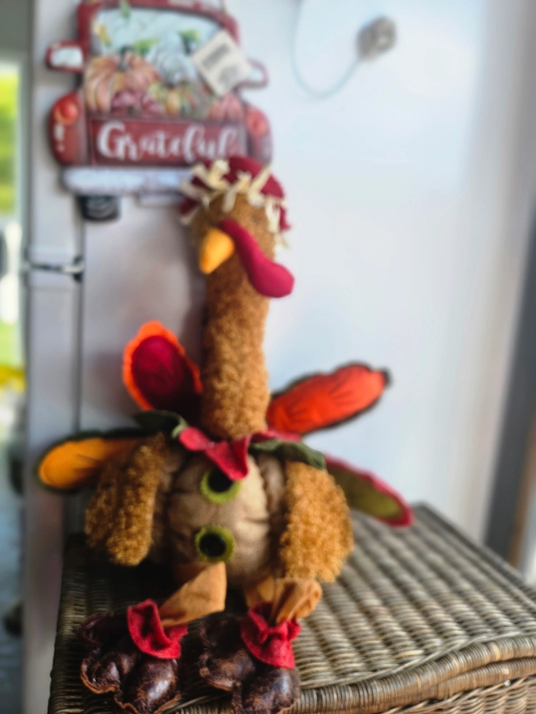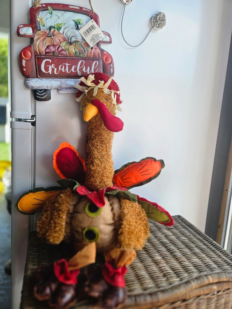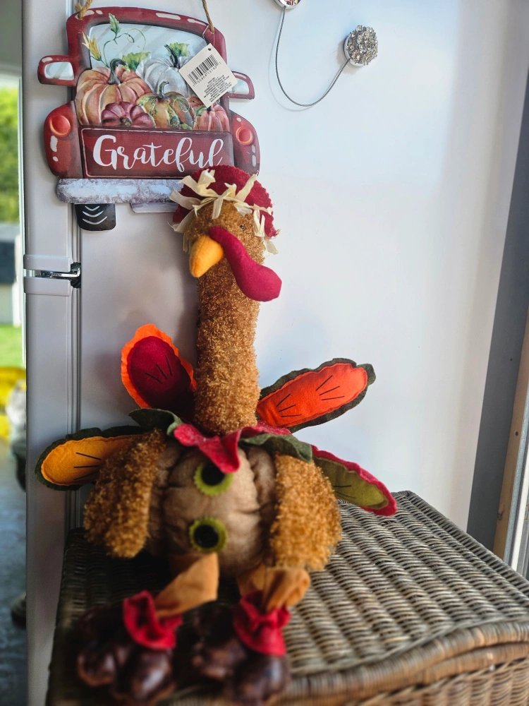 Here's a cute turkey plush decoration! It's got a charming, rustic look with its mix of textures and colours. Perfect for adding a touch of autumn to any room Metal sign included Sfpf Oshawa Harmony Road South at 401