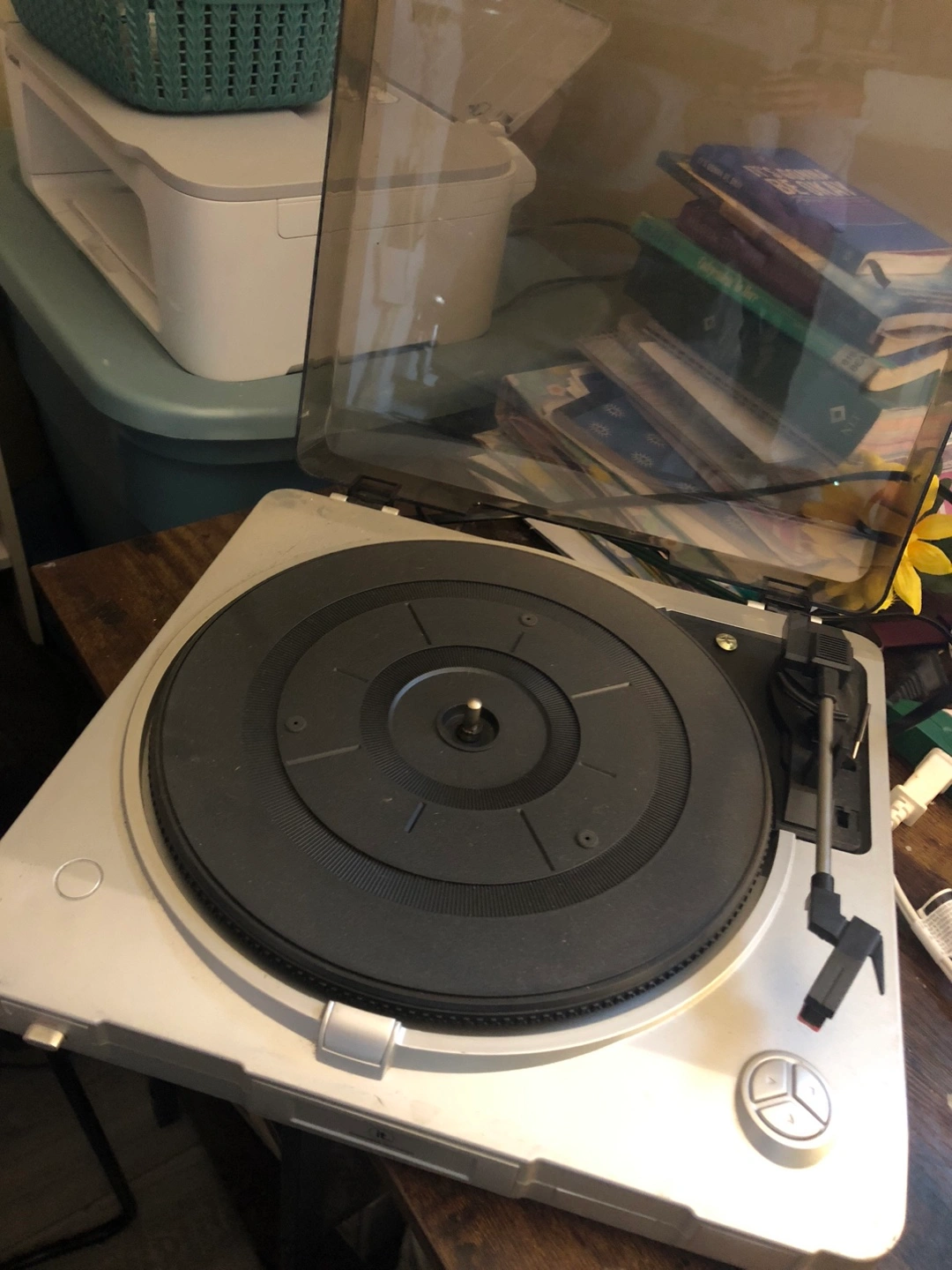 Selling a used turntable record player. It appears to be in good condition and ready to play your favourite records! It's silver in colour and has a transparent lid to protect your records while playing