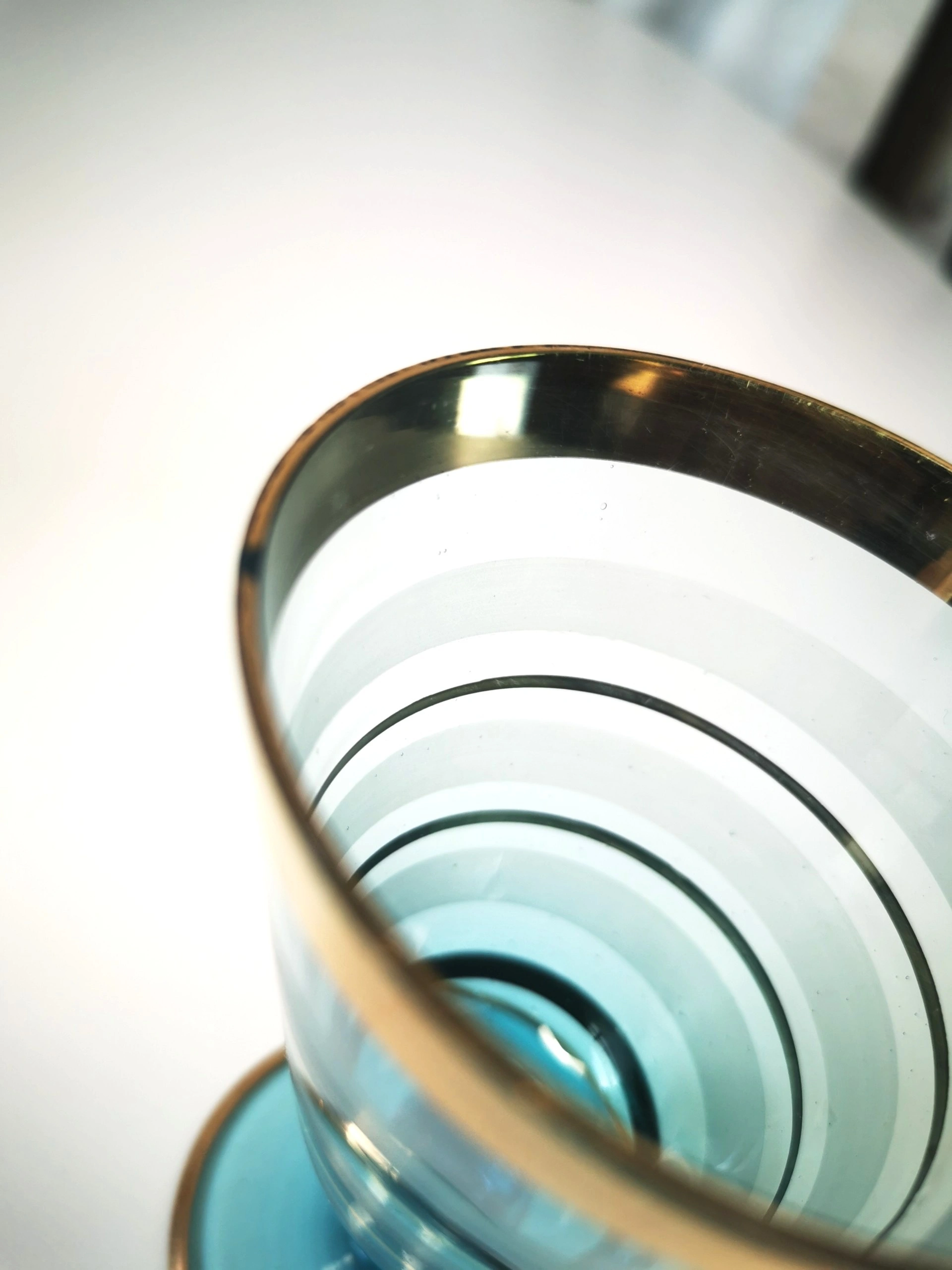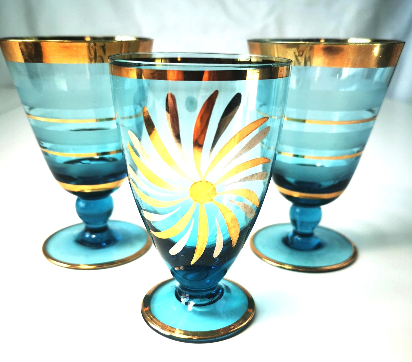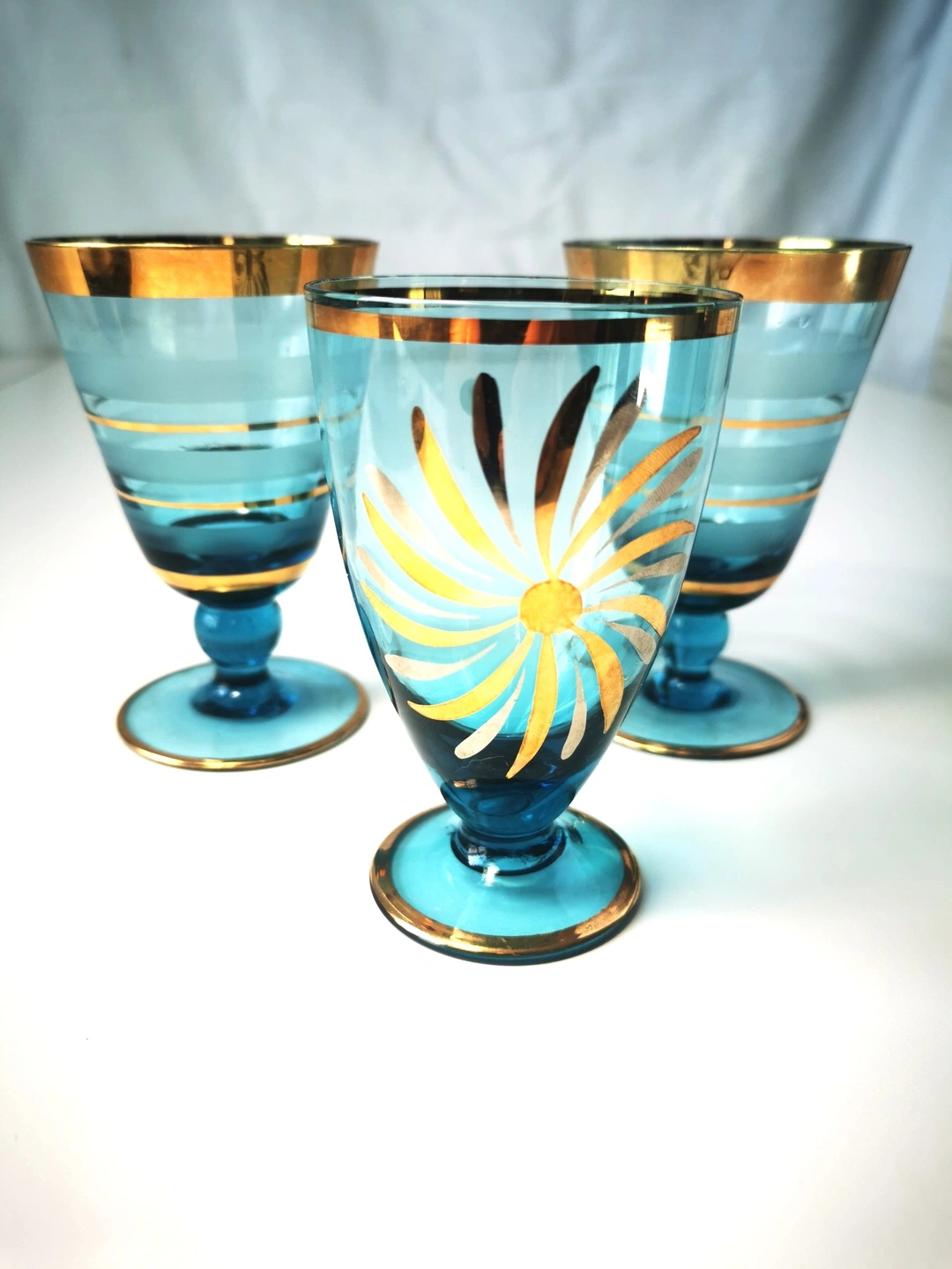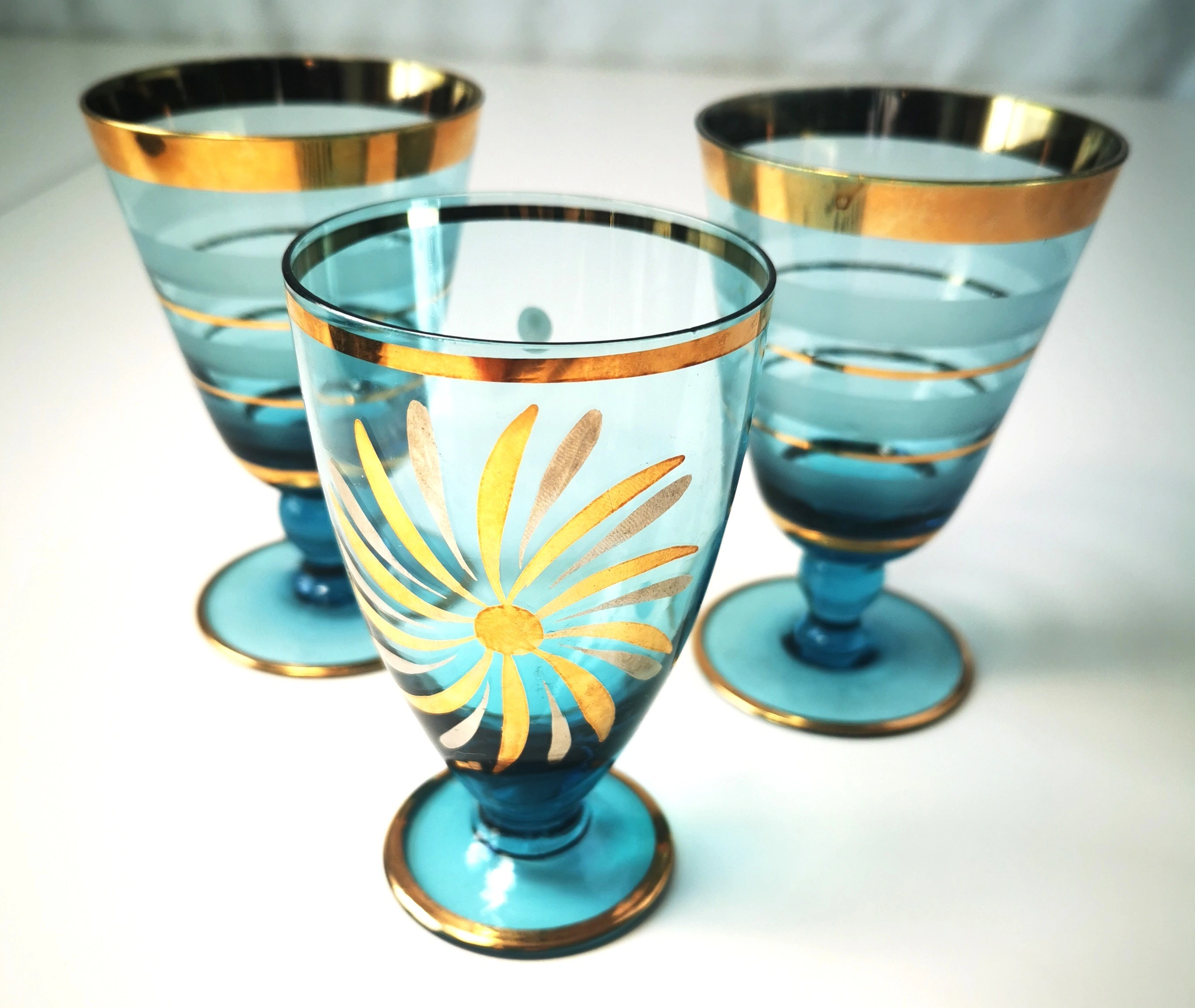 This elegant set of 3 vintage turquoise glassware with gold accents is a stunning addition to any home decor. The vibrant blue color and intricate gold accents add a touch of fun and curiosity to your dining experience. Made from high-quality glass, this set is perfect for collectors or anyone looking to add a unique and stylish touch to their kitchen or dining room. Dimensions: Two striped 4.25 inches height, Diameter 2.75 inches Single with flower height 4 inches, Diameter 2.25 inches CONDITION: Good vintage condition some light paint wear please reference detailed photos as part of the description
