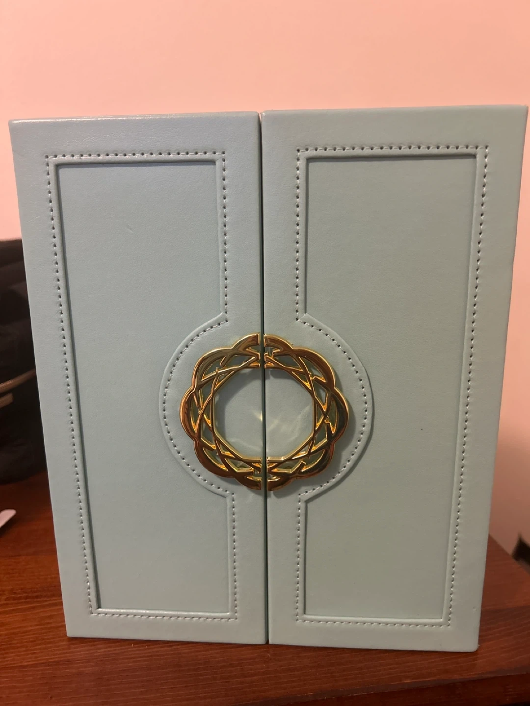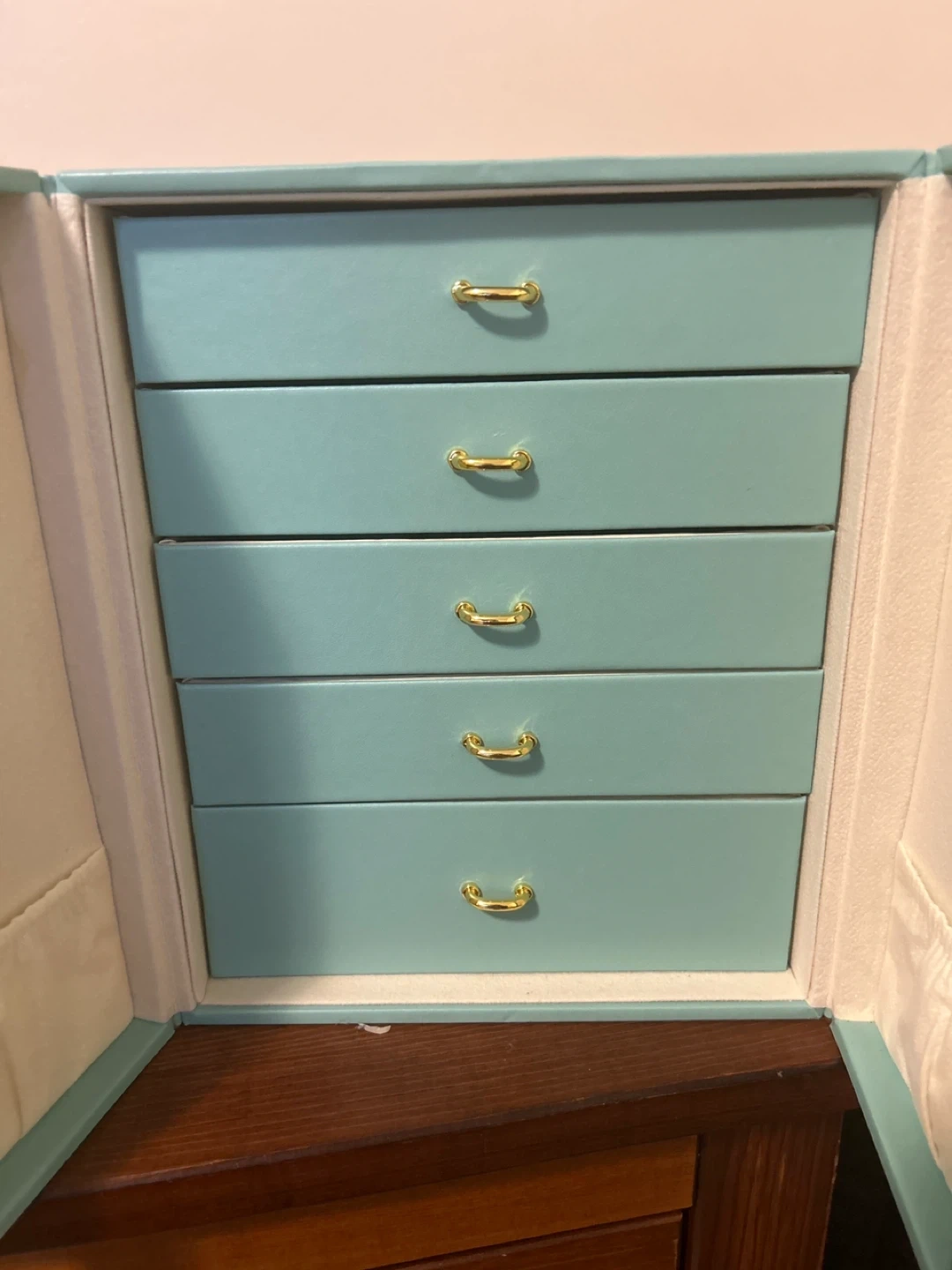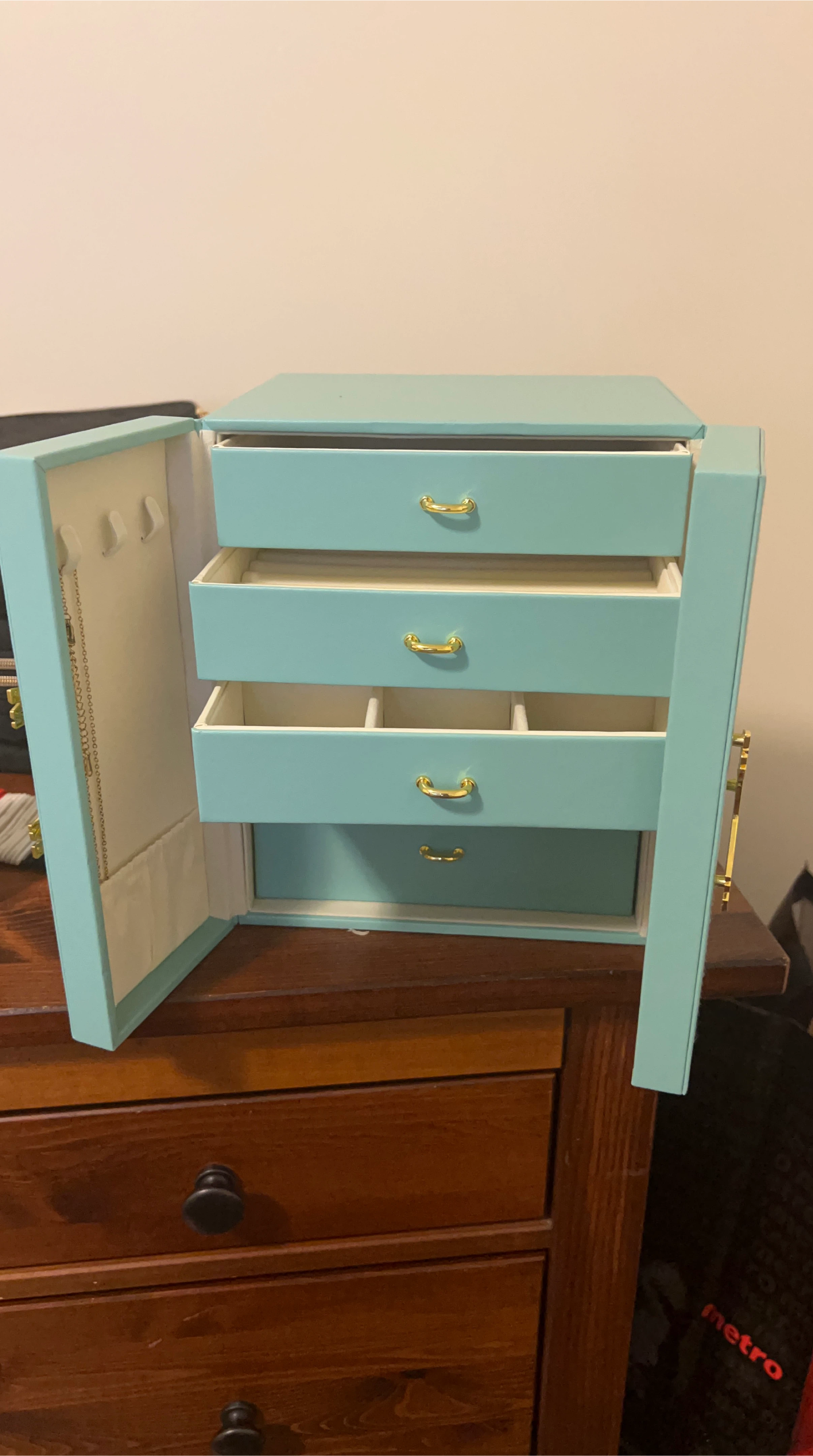Here's a lovely turquoise jewellery box with gold-coloured handles! It has multiple drawers and compartments for organizing all your favourite pieces. It's in great condition and ready to find a new home