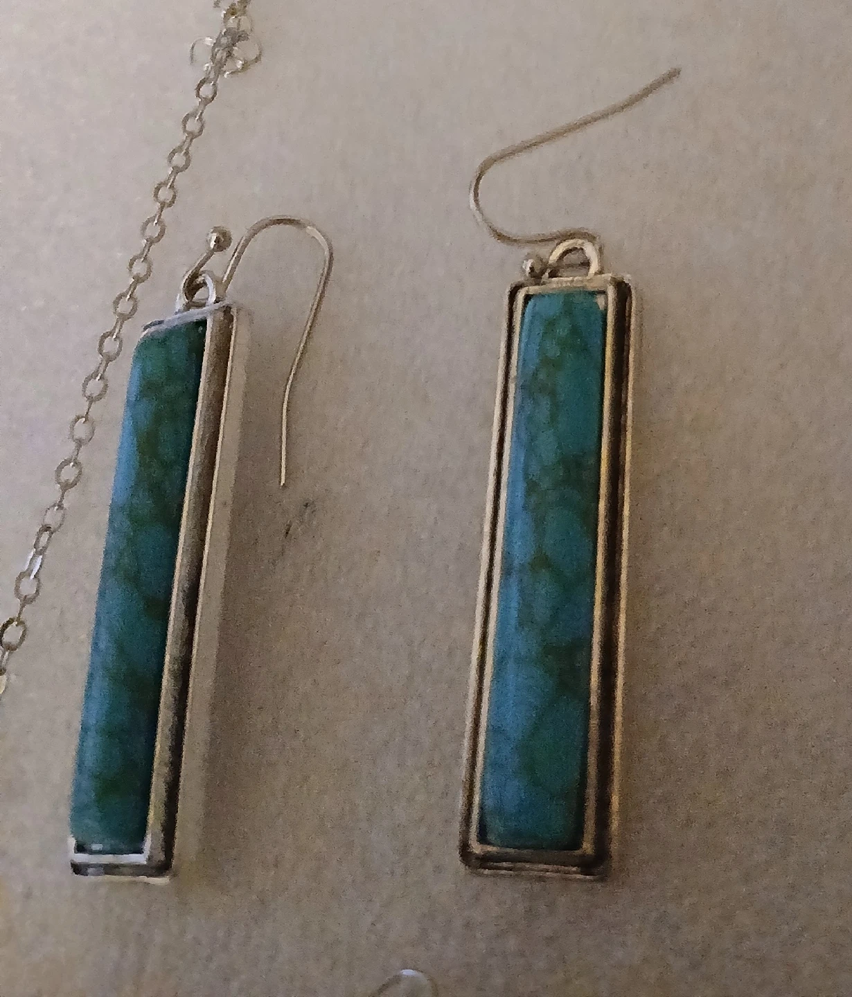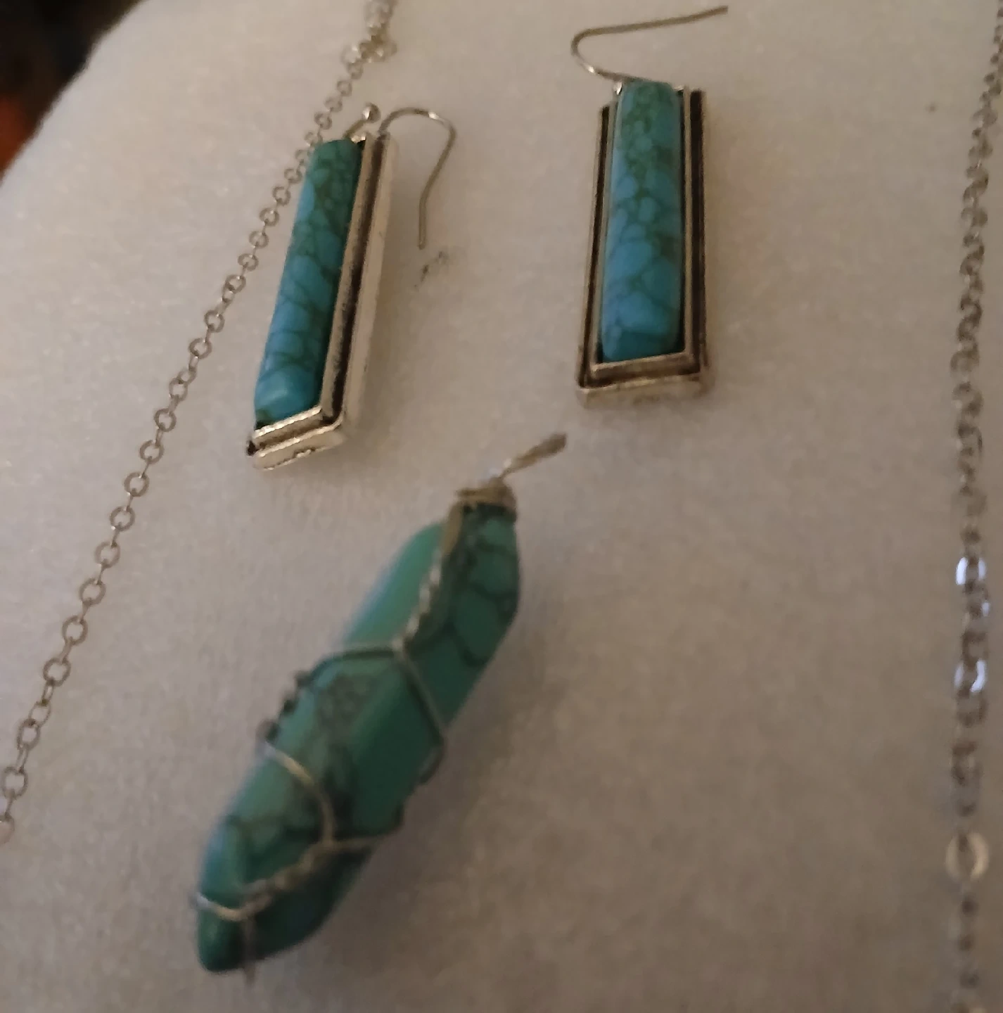 1000+Here's a lovely set including a necklace and earrings featuring turquoise stones. They appear to be in good condition and would make a great addition to any jewelry collection!