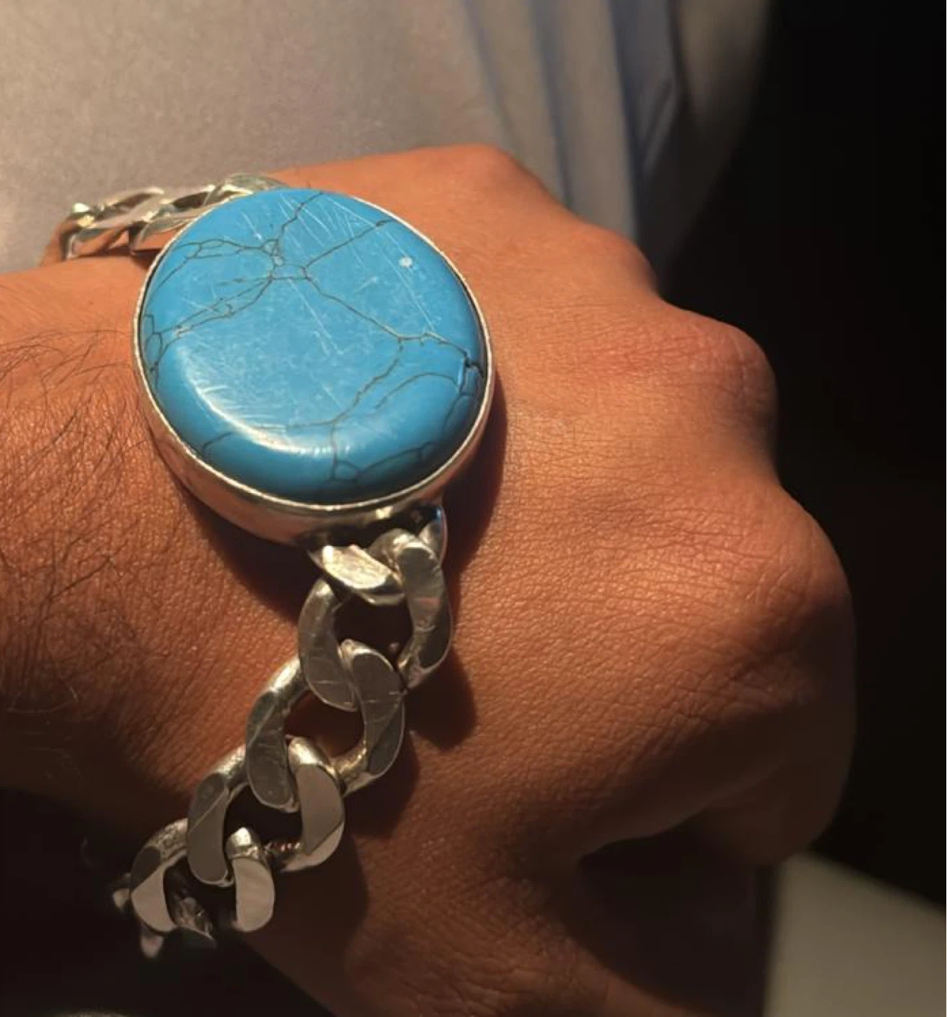 Selling a men’s bracelet with a turquoise stone and silver chain. It's in great condition and would make a lovely addition to any outfit! It is 91 grams and is pure Italian silver.