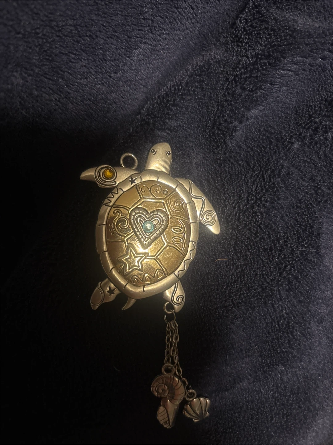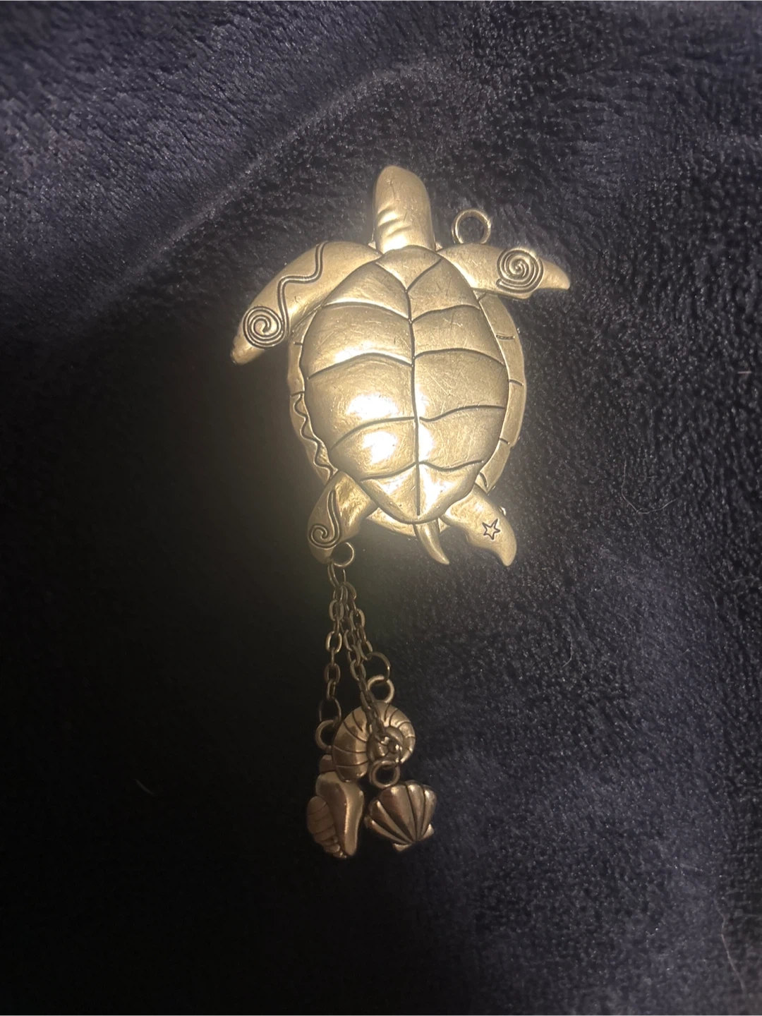 60Cute turtle pendant necklace! It has a unique design on the back and some shell charms hanging from the bottom. Perfect for adding a bit of whimsy to any outfit