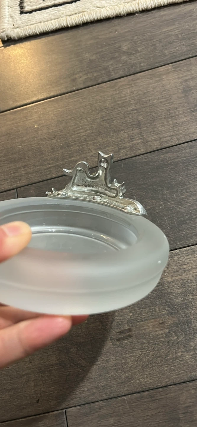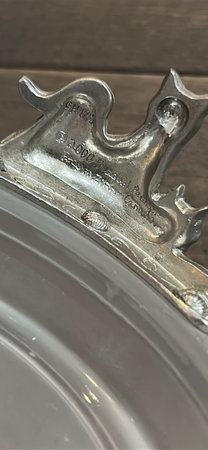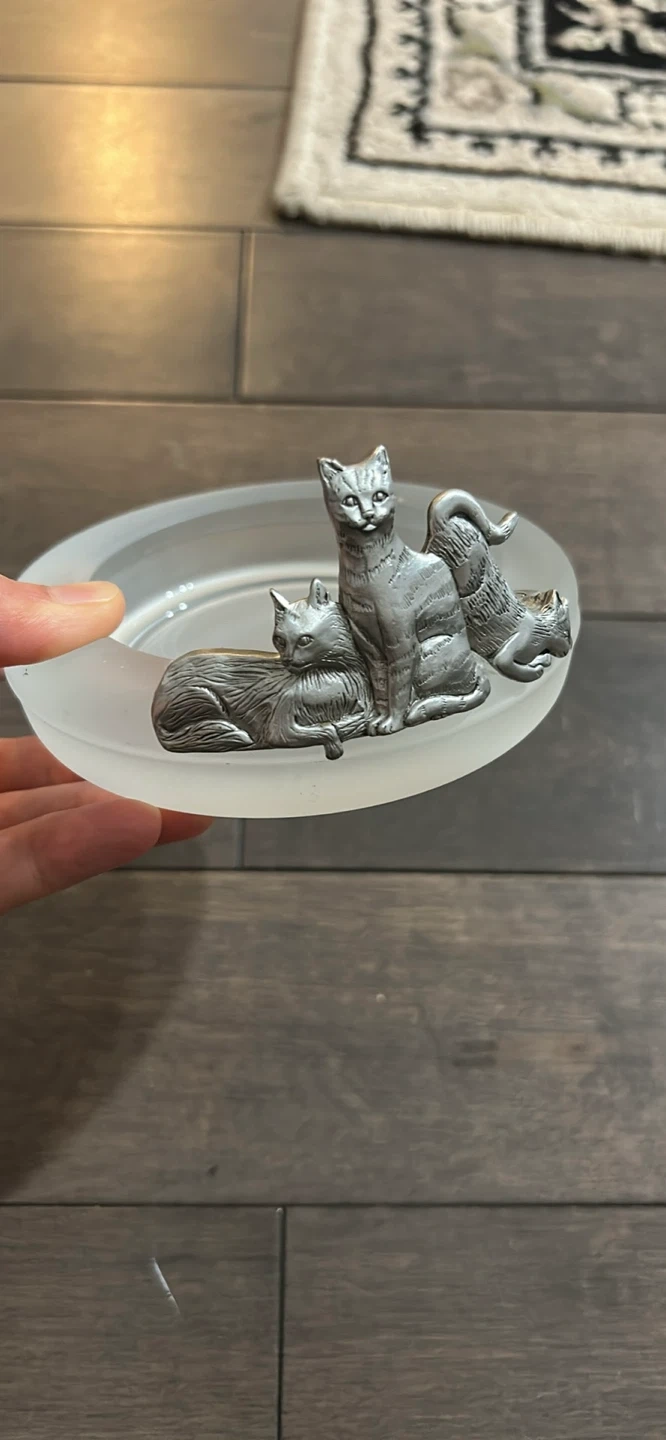Frosted glass dish with a pewter decorative cat accent. "© 2000", "Brummel & Smith, Paramount, Canada" visible on pewter. Dish has a slightly frosted finish.