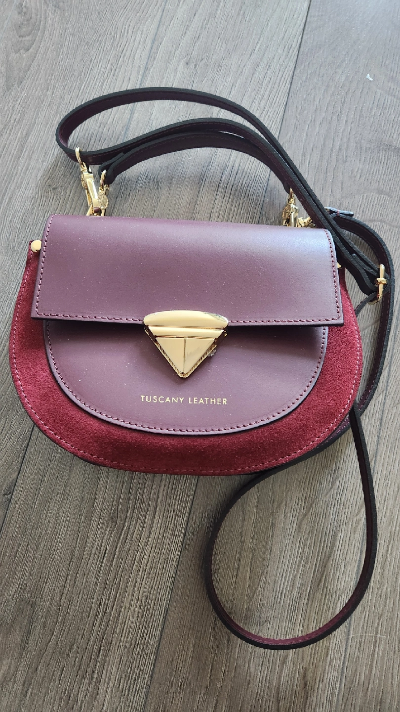 Selling a beautiful Tuscany Leather crossbody bag in a burgundy colour! The bag is in new, never used condition and features a unique triangular gold clasp. Perfect for adding a touch of elegance to any outfit!