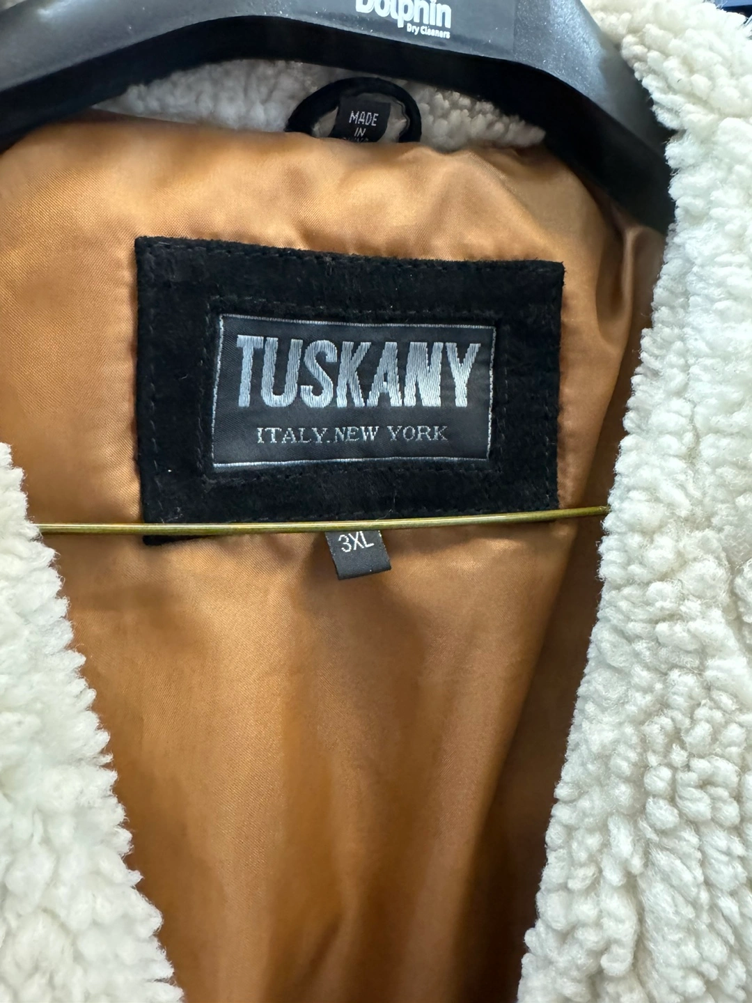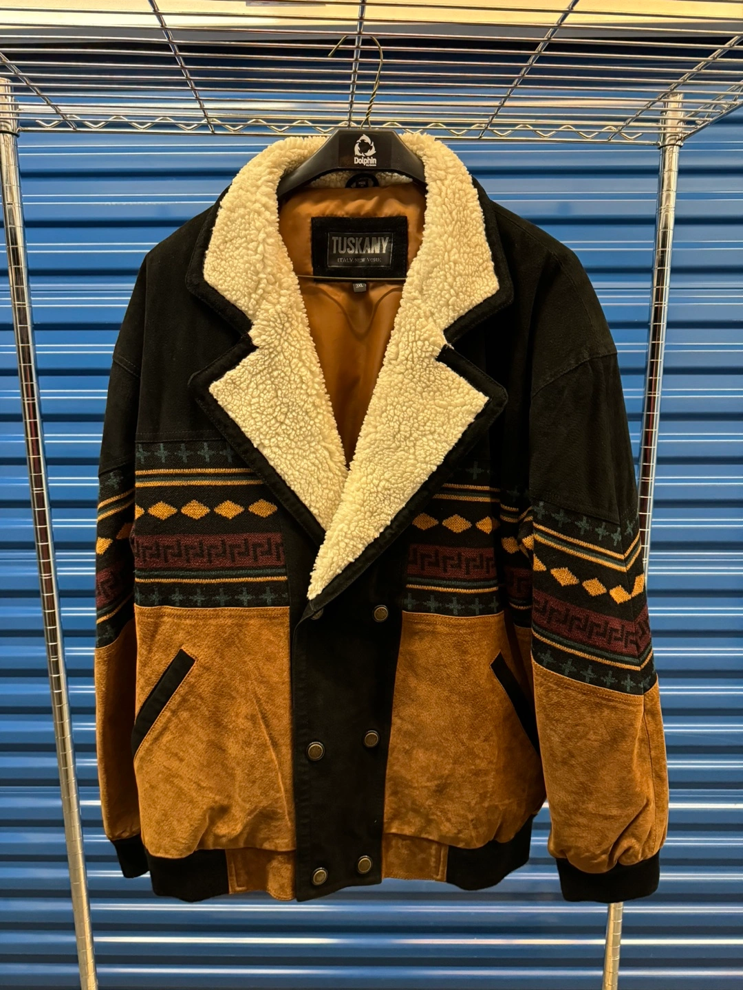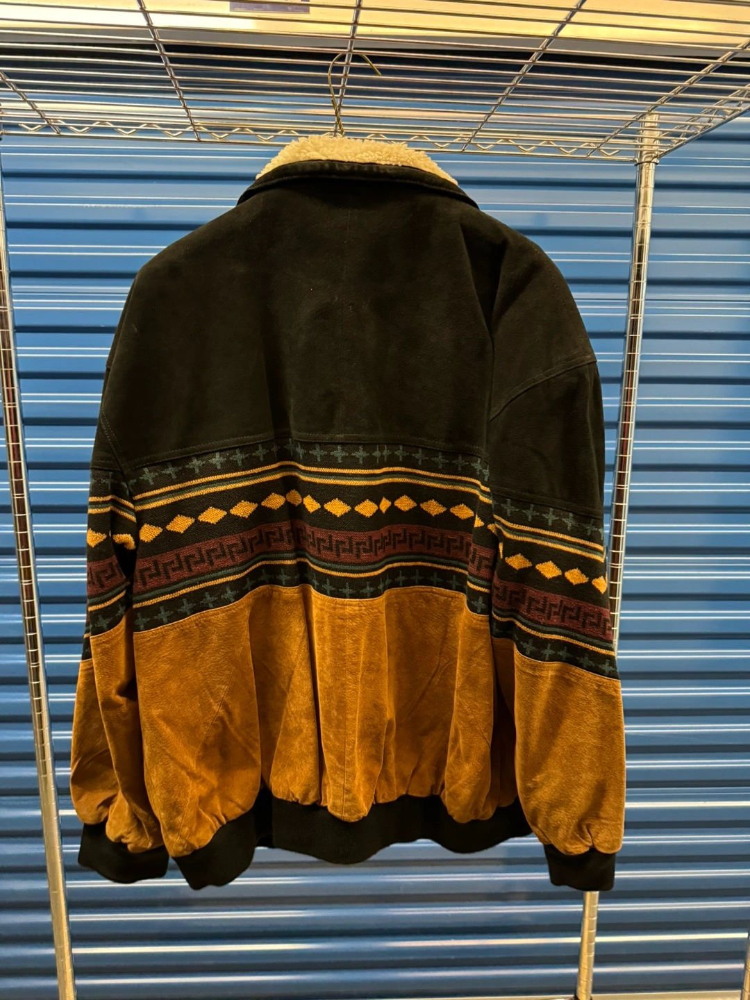 Black and brown suede jacket with an embroidered pattern. Features a sherpa lining. Size 3XL.