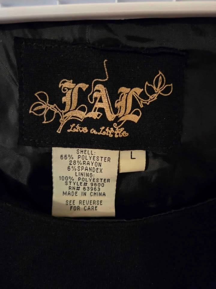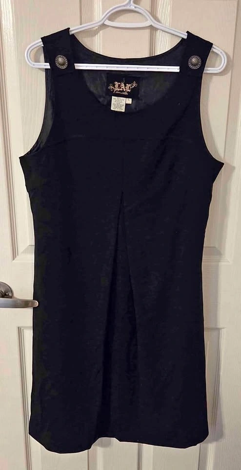 Cute Y2K style black jumper dress by Live a Little (LAL). Features wide straps with decorative metal buttons and a flattering pleat in front. Easy to dress up or layer over a top for a trendy streetwear look. Women’s Size Large. Fabric: 66% polyester / 28% rayon / 6% spandex. Fully lined. Great preowned condition – no holes or stains. Approx knee length. Perfect for fall + winter layering or a versatile night-out.