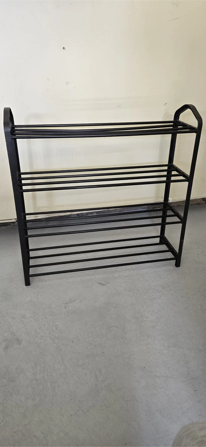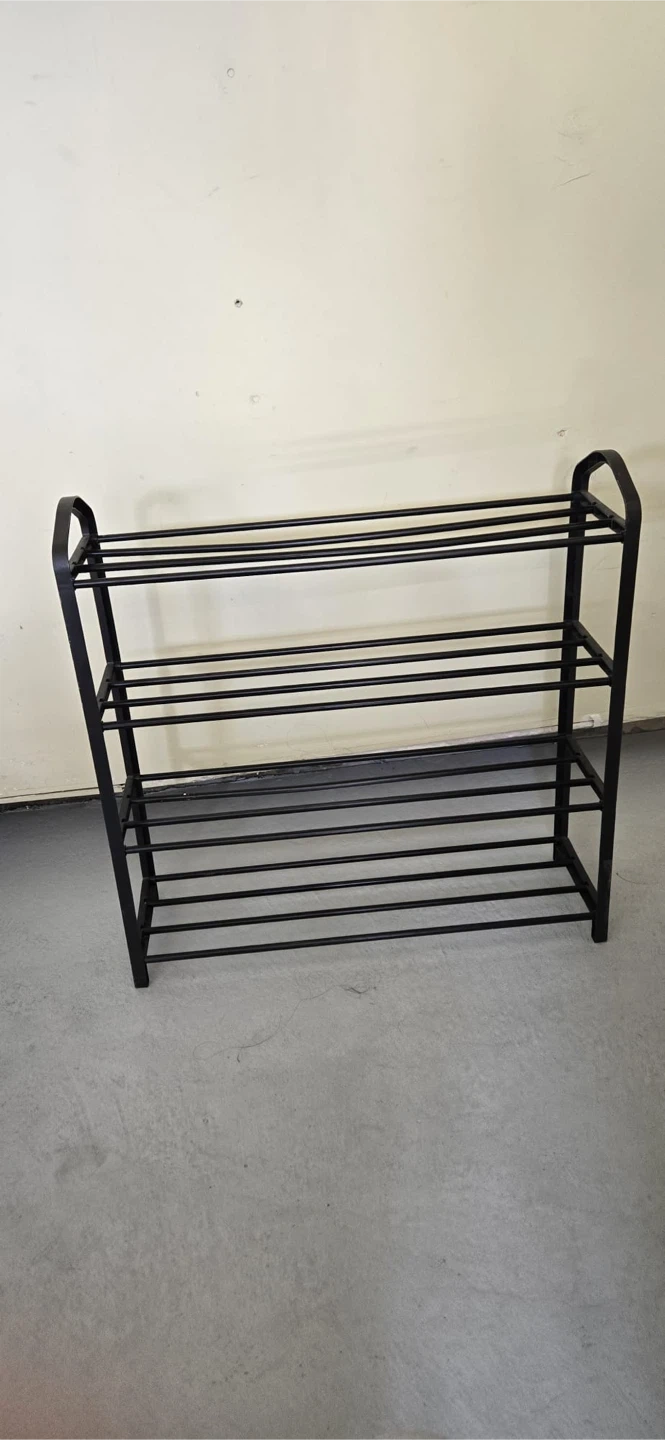 Looking to declutter your entryway? I'm selling a gently used black metal shoe rack! It features three tiers, providing ample storage for your shoes. It's sturdy and in great condition, ready to help organize your footwear collection