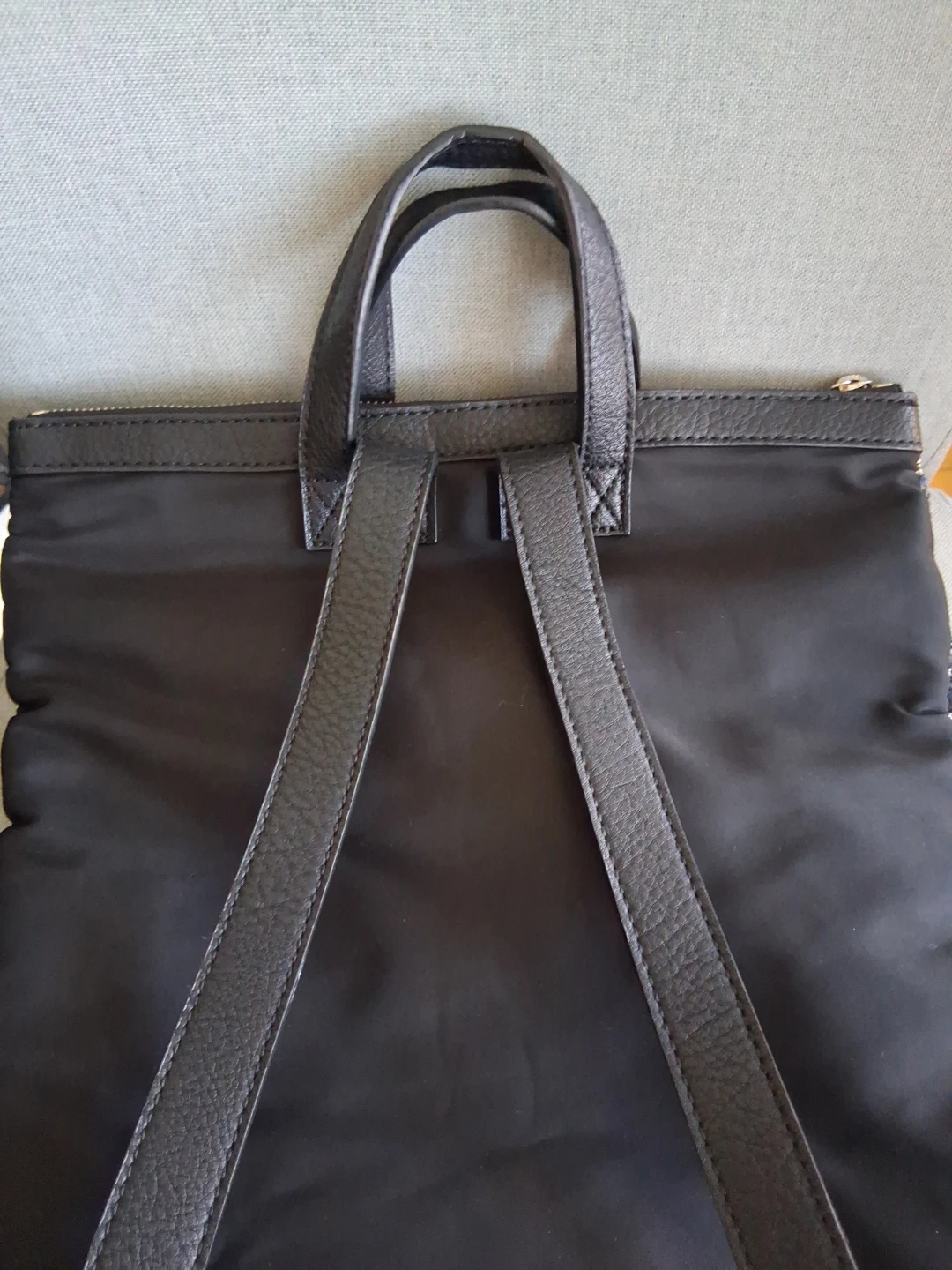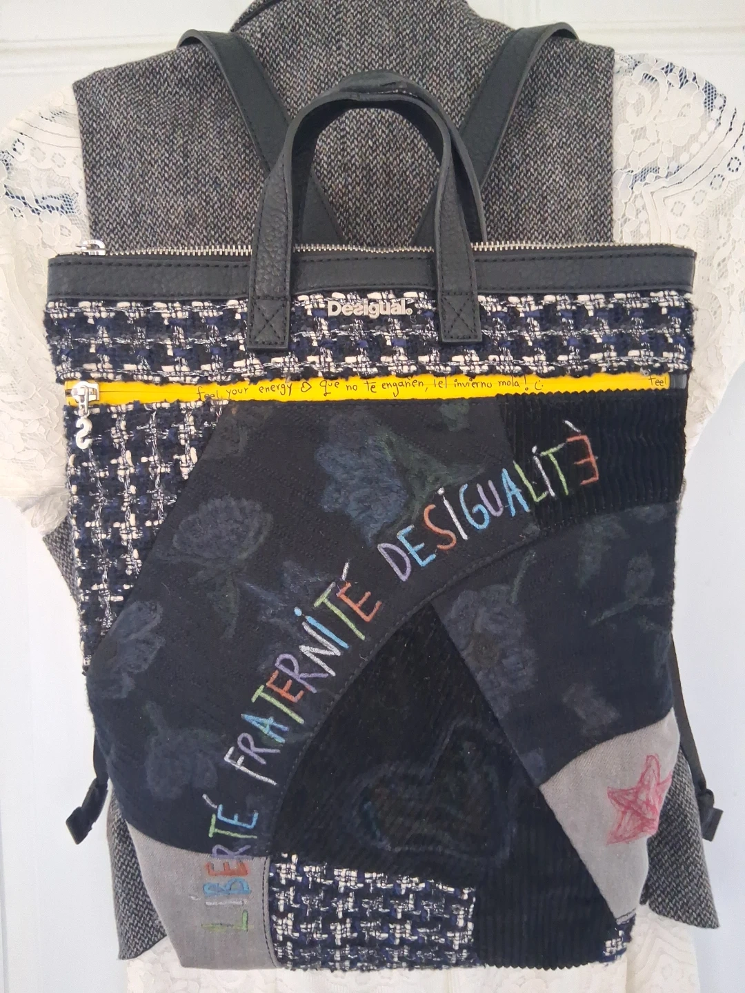 NewDesigual backpack with a patchwork design. It features a tweed-like fabric and a large embroidered front panel with the text "FRATERNITÉ DESIGUALITÉ". Includes a yellow accent zipper. The back has black nylon with leather adjustable straps and handles.