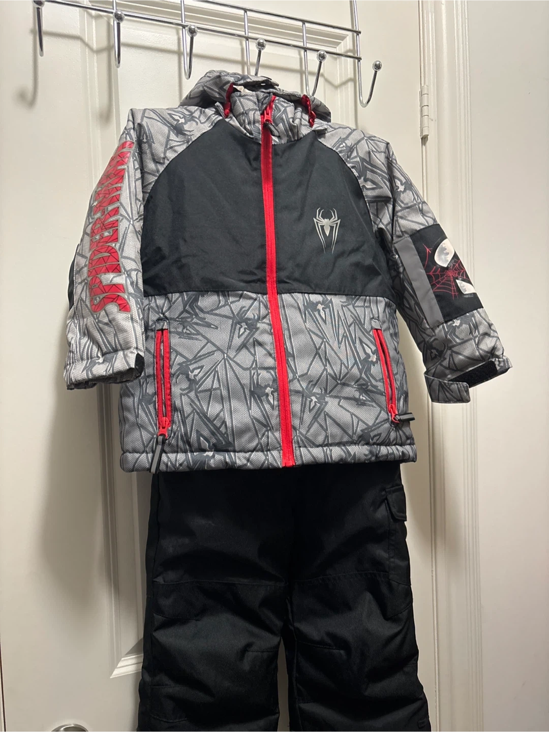 Selling a Spider-Man snowsuit for kids! It's in great condition and perfect for keeping your little one warm during the winter. The snowsuit is a size 4 and features a cool Spider-Man design with red accents. Ready for some snowy adventures!