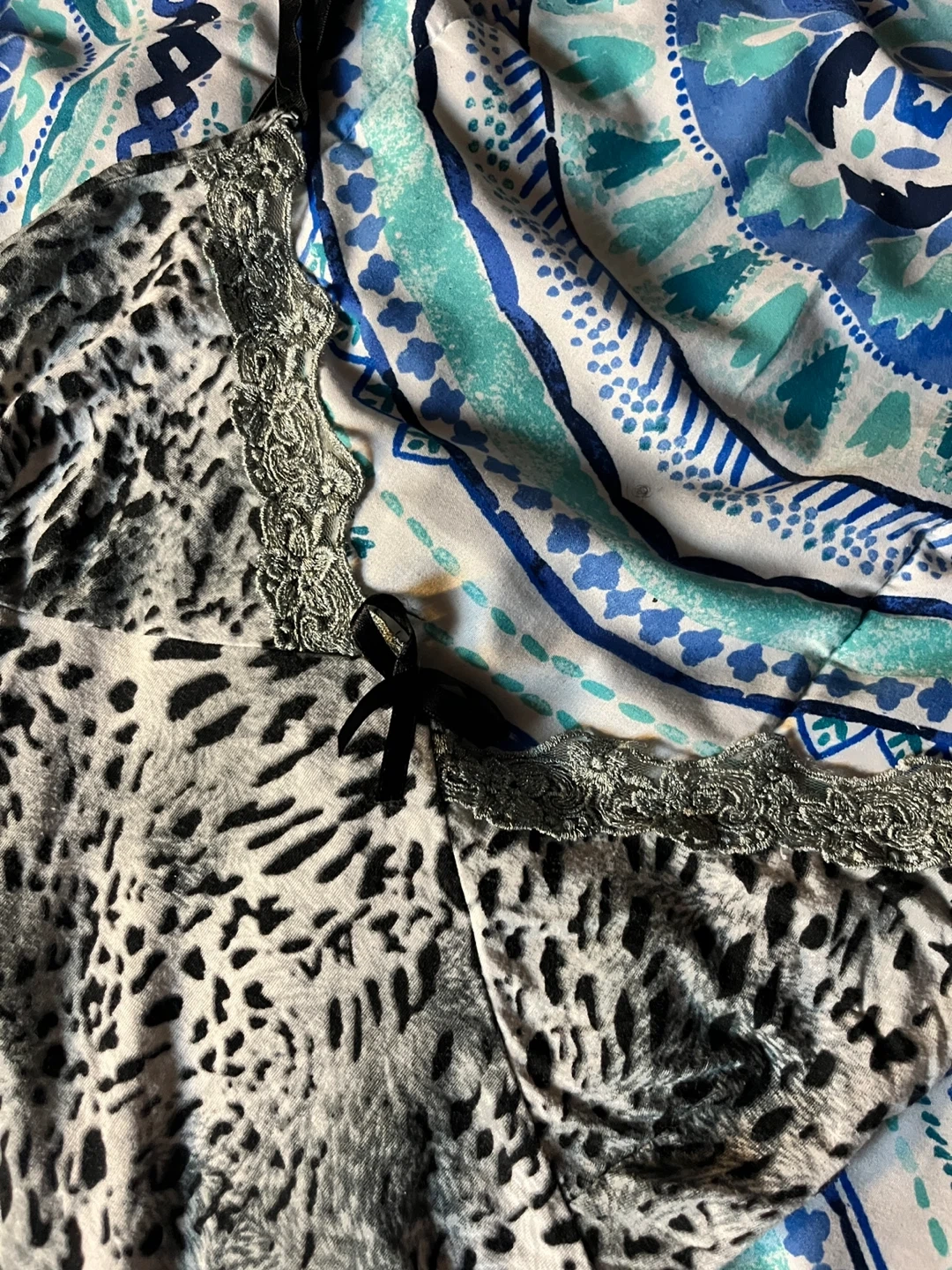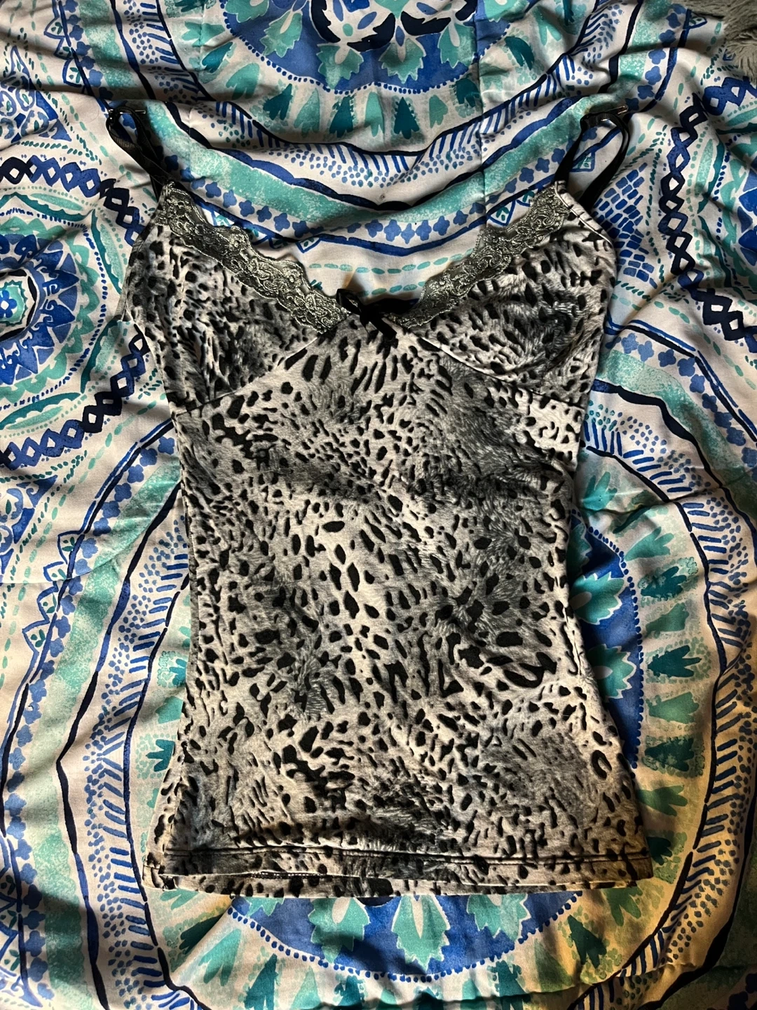 Snow leopard print camisole with lace trim.