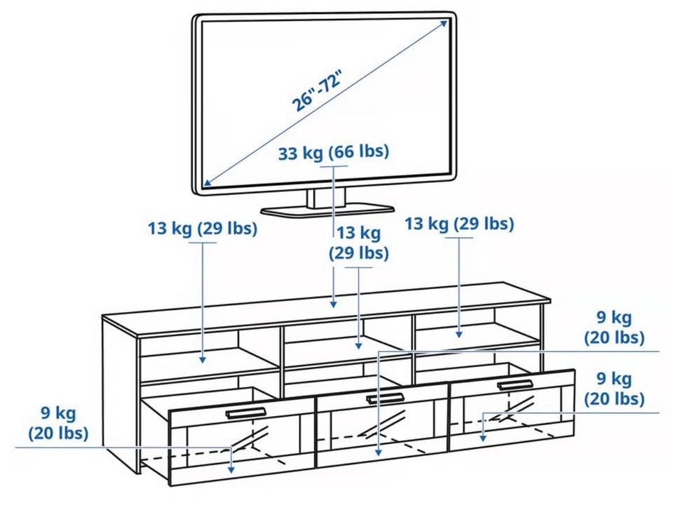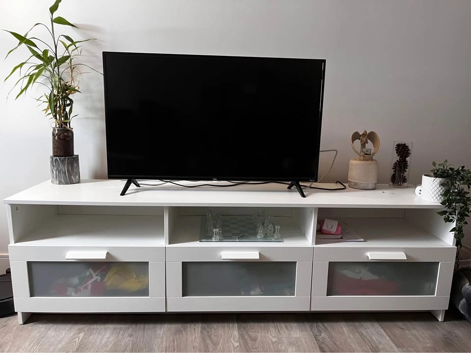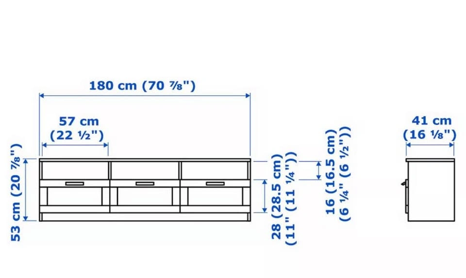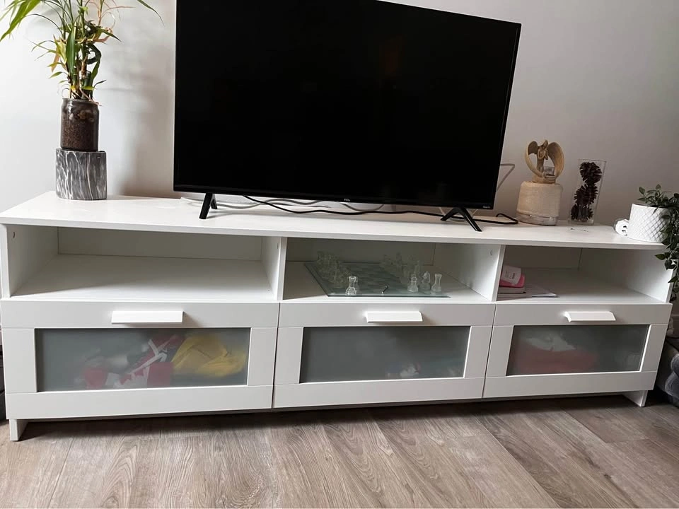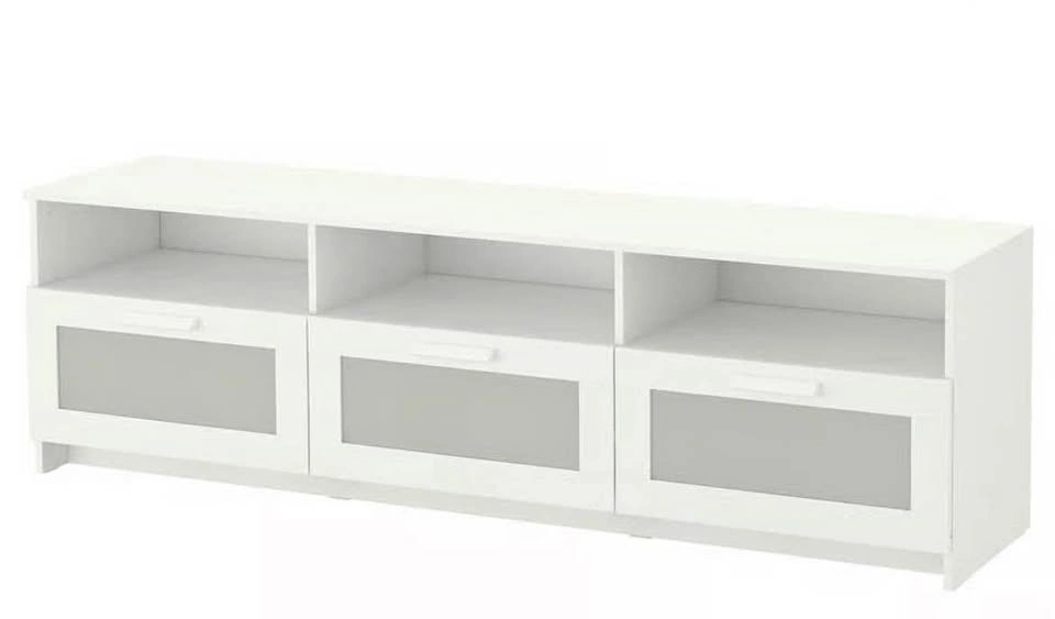 65Used Like New TV bench, white, 180x41x53 cm (70 7/8x16 1/8x20 7/8 ") When it’s organized by the TV it’s easier to indulge in your favorite TV series. Keep your games, controls and accessories in the large drawers and feed the cords through the outlets in the back. Product details This TV unit has large drawers that make it easy to keep remote controls, game controllers and other TV accessories organized. Cable outlets make it easy to lead cables and cords out the back so they’re hidden from view but close at hand when you need them.