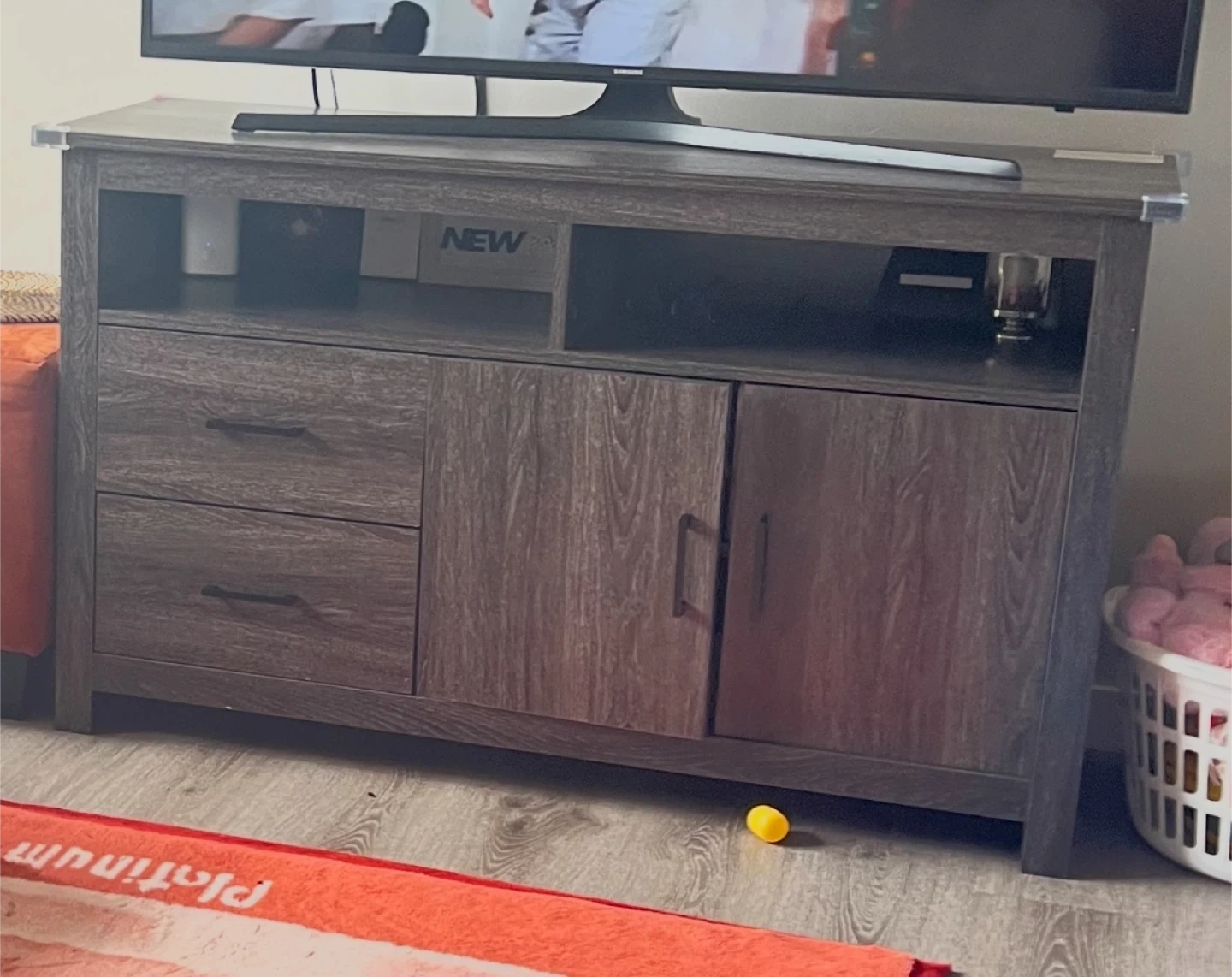 48Selling a sturdy TV stand in a dark brown wood finish! It features two drawers for storage and a cabinet with a door. There's also an open shelf for media devices or decor. It's in great condition and ready for a new home