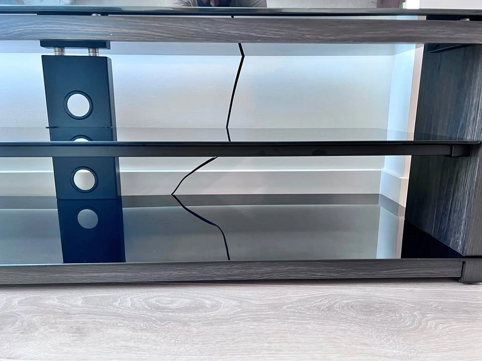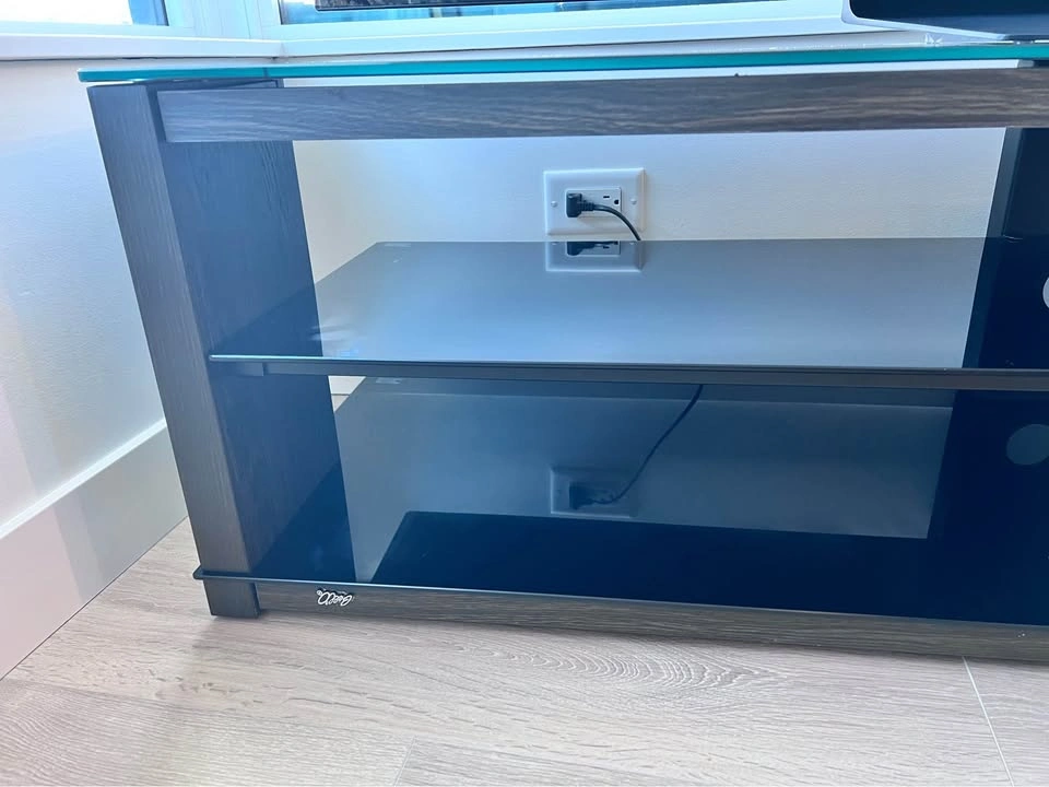 10Sleek glass TV stand in good condition, sturdy and stylish. No cracks or breaks — all glass panels and metal supports are solid and stable. Suitable for TVs up to 65 inches with ample space for consoles, speakers, or decor. Pickup only.