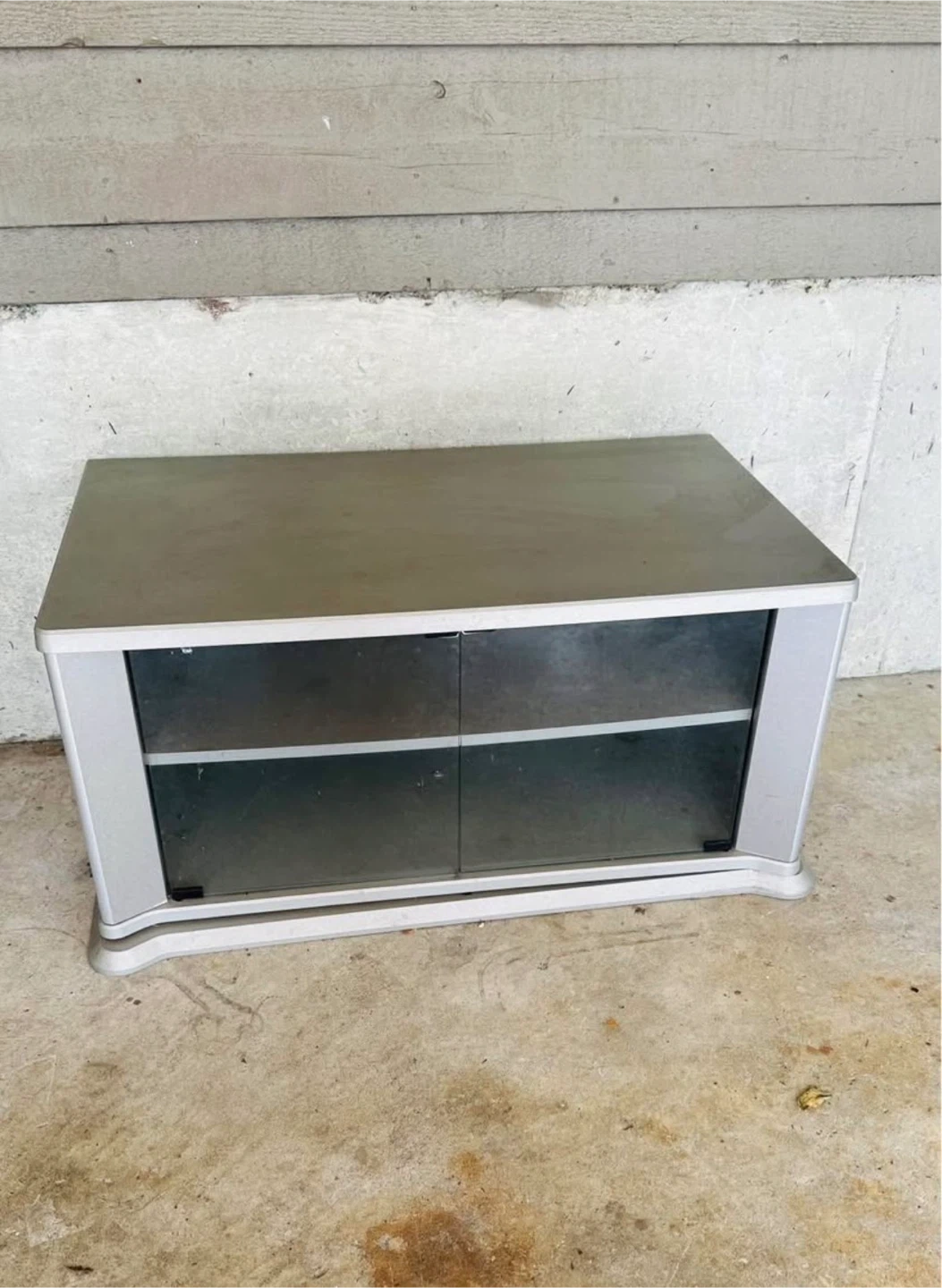 10Selling a silver TV stand that's perfect for your living room! It features glass doors and shelves inside to store your media devices or decor. It's in good condition and ready for a new home!