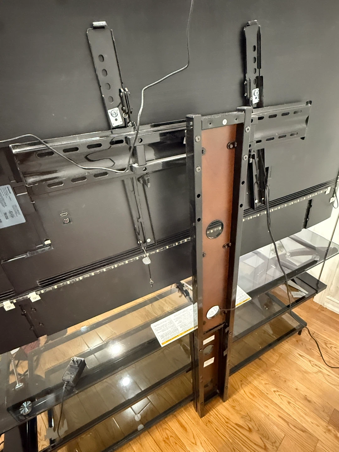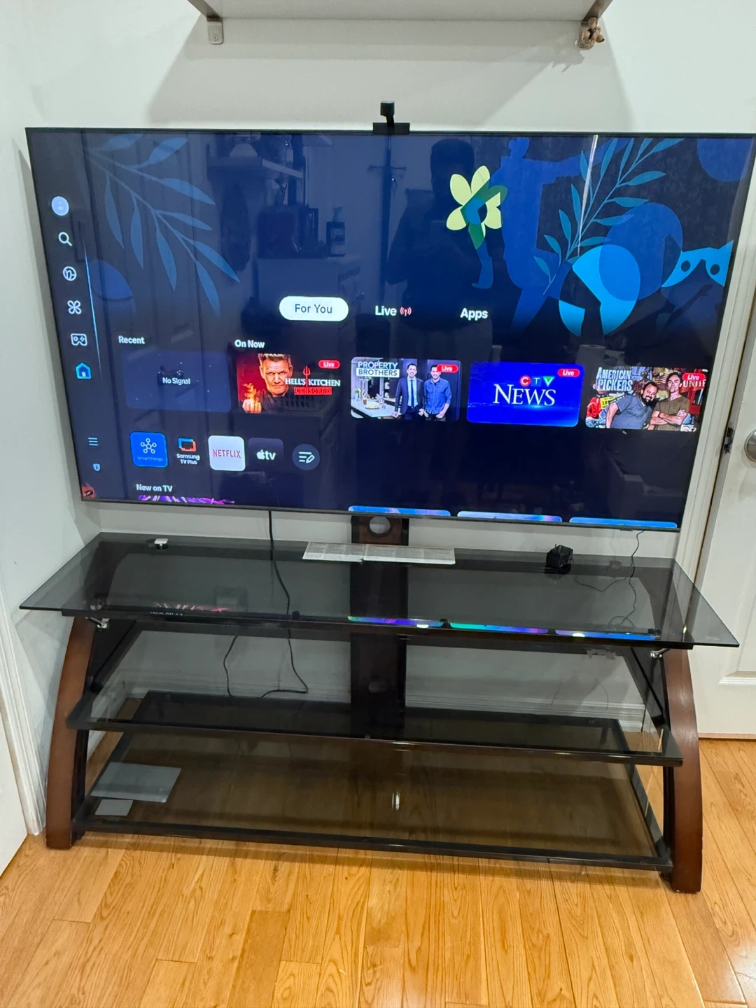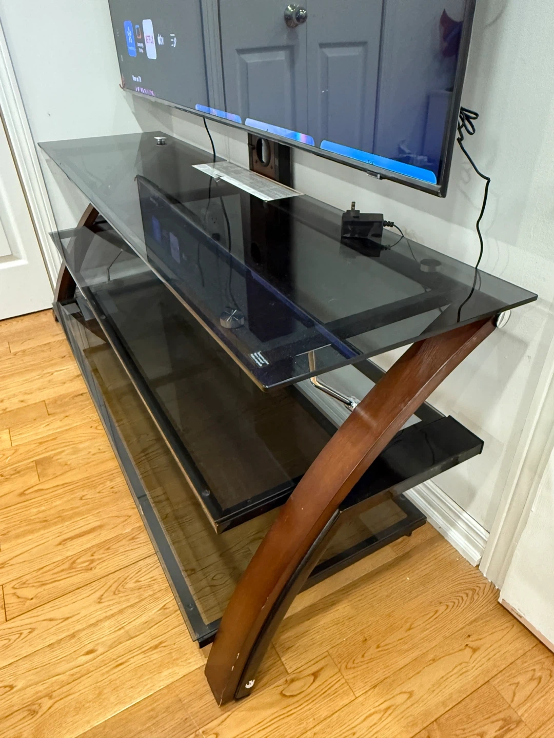 Selling a three-tiered TV stand with glass shelves and built-in mount. It's in great condition and has a sleek design. Perfect for your living room or entertainment area!