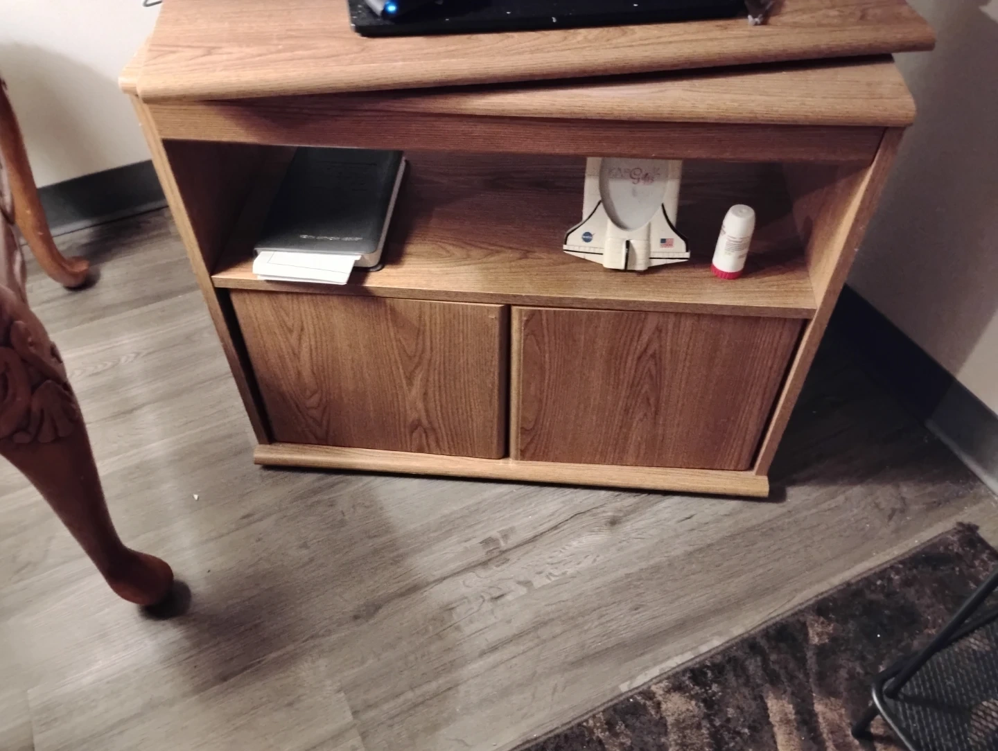 77Here's a sturdy TV stand with swivelperfect for adding some storage to your living room or bedroom. It has a shelf and a cabinet with two doors, great for keeping things organized and out of sight. It's in good condition and ready for a new home!