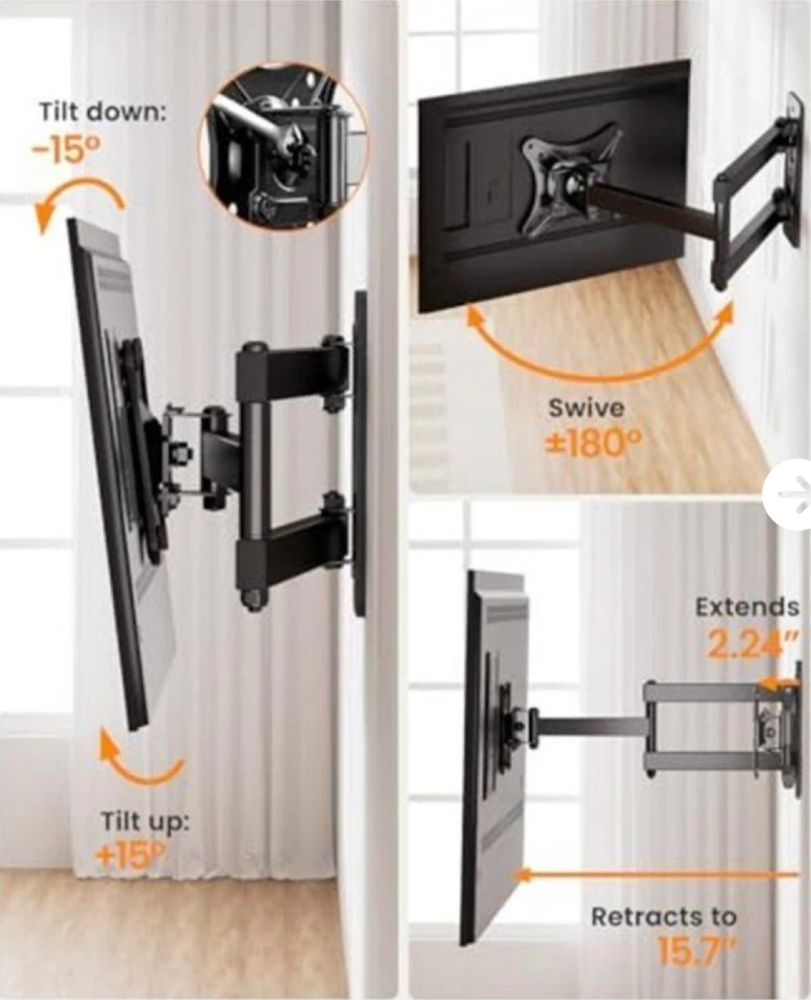 43Selling a sturdy TV wall mount bracket in excellent condition! It can tilt up +15° and down -15°, and swivel ±180°. The bracket extends 2.24" and retracts to 15.7". Comes with all the necessary hardware and an instruction manual. Box included!
