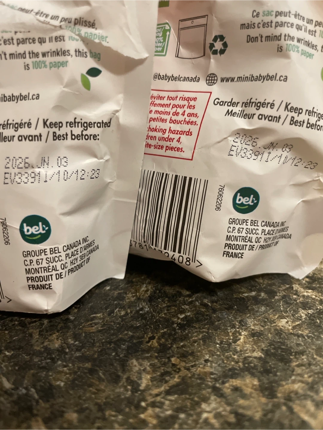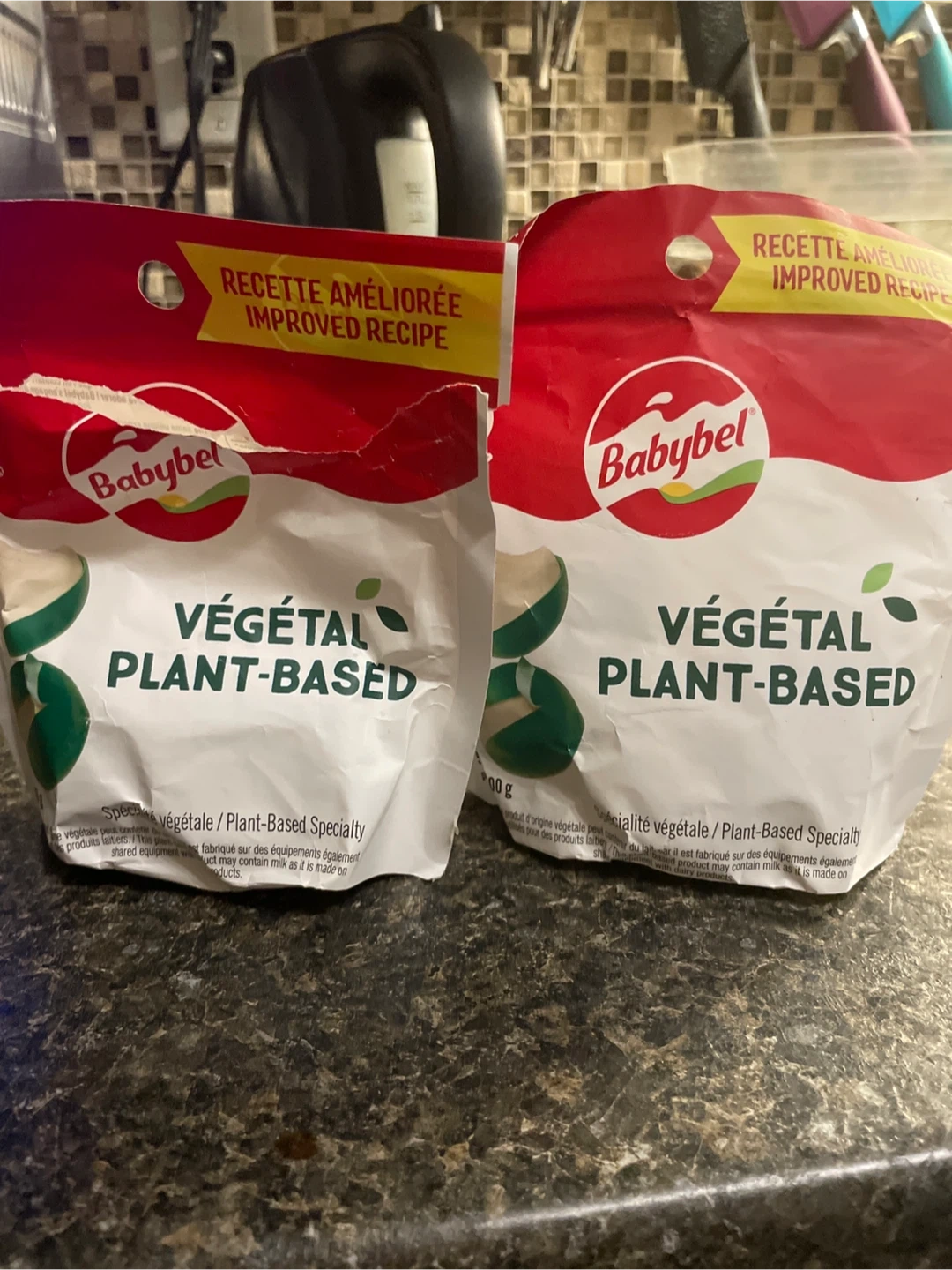 Two packs of Babybel Plant-Based cheese snacks. "Improved recipe" is printed on the packaging. Keep refrigerated. Best before: 2026-JUN-3rd