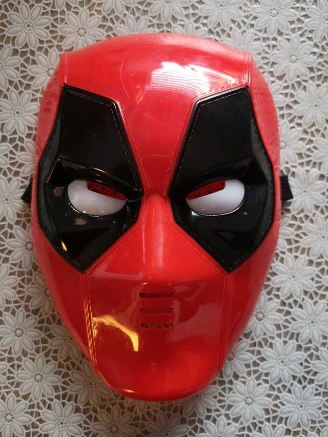 Show off your Marvel fandom with this used Deadpool mask, perfect for costumes or display! This distinctive red and black mask captures Deadpool's signature look. Please note, as a pre-owned item, it has some wear and tear. If the ad is up, the item is still available! Don't miss out on adding this fun piece to your collection!