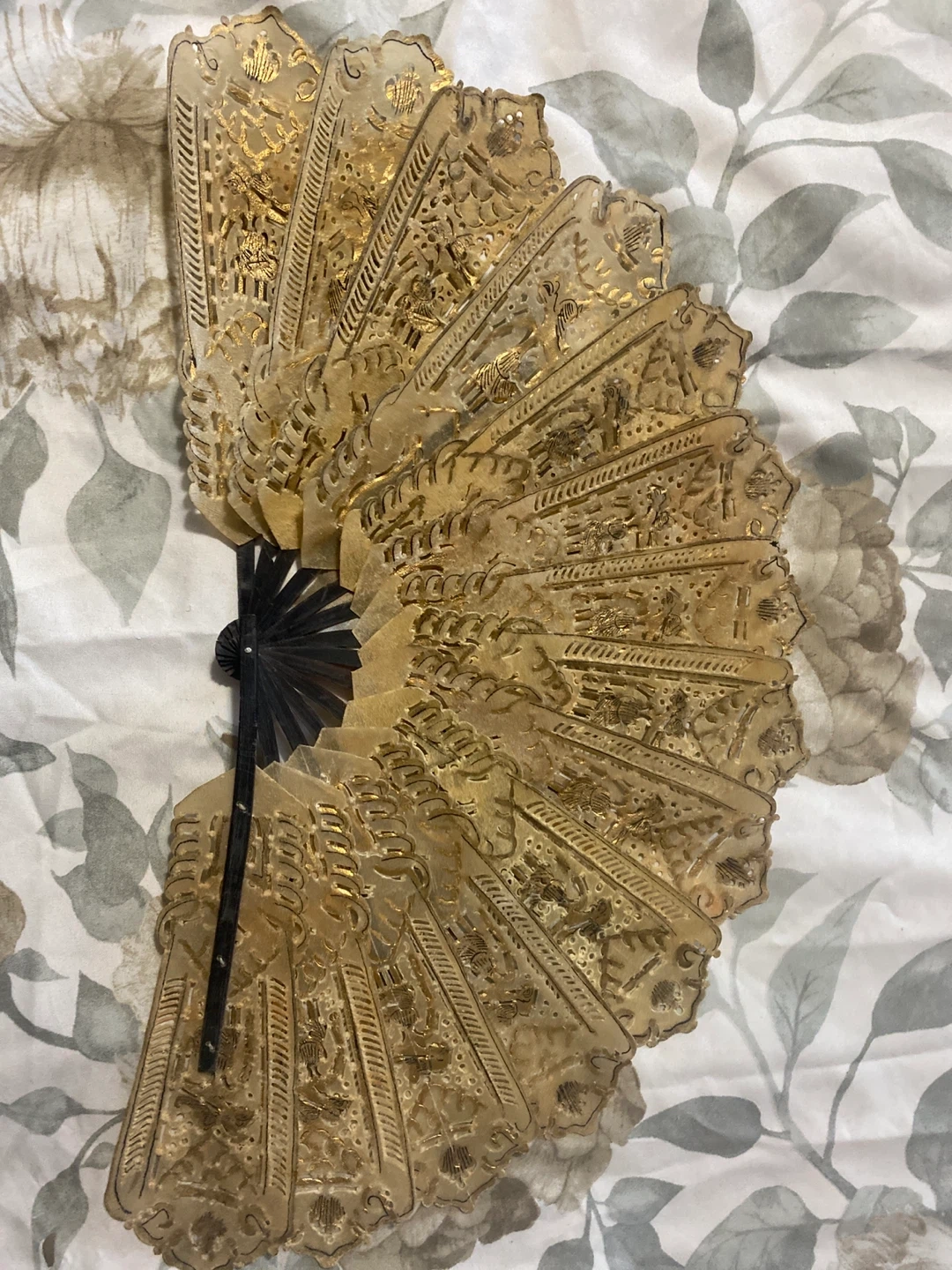 This is a beautiful vintage folding fan, intricately carved with detailed scenes. It's made of a lightweight, parchment-like material with a black handle. When opened, it expands to create a lovely display.