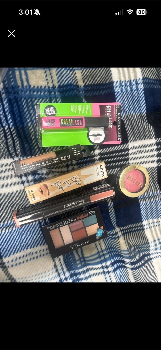 Maybelline Great Lash Mascara in Very Black. ELF 16HR Camo Concealer. NYX Epic Ink Liner and a NYX Matte Lipstick. Milani Baked Blush. Rimmel Mini Power Palette. It's a great makeup bundle! Pick up cash only