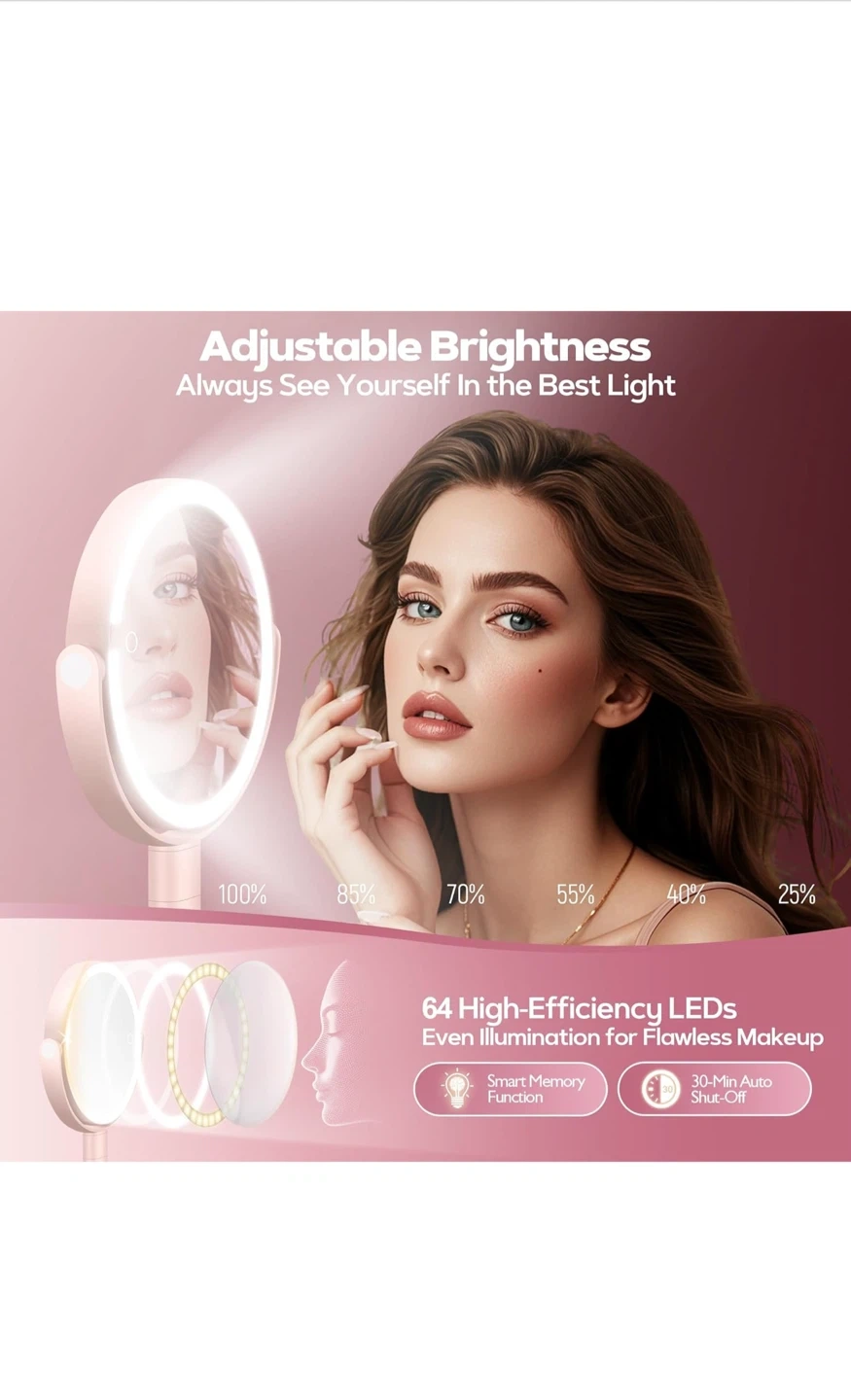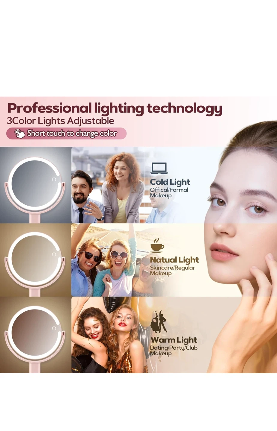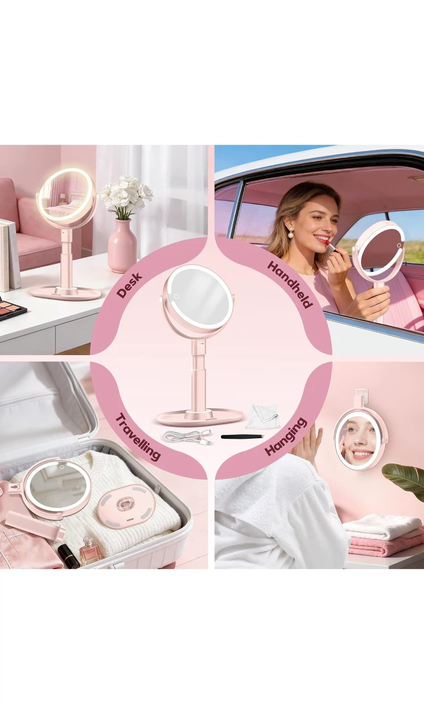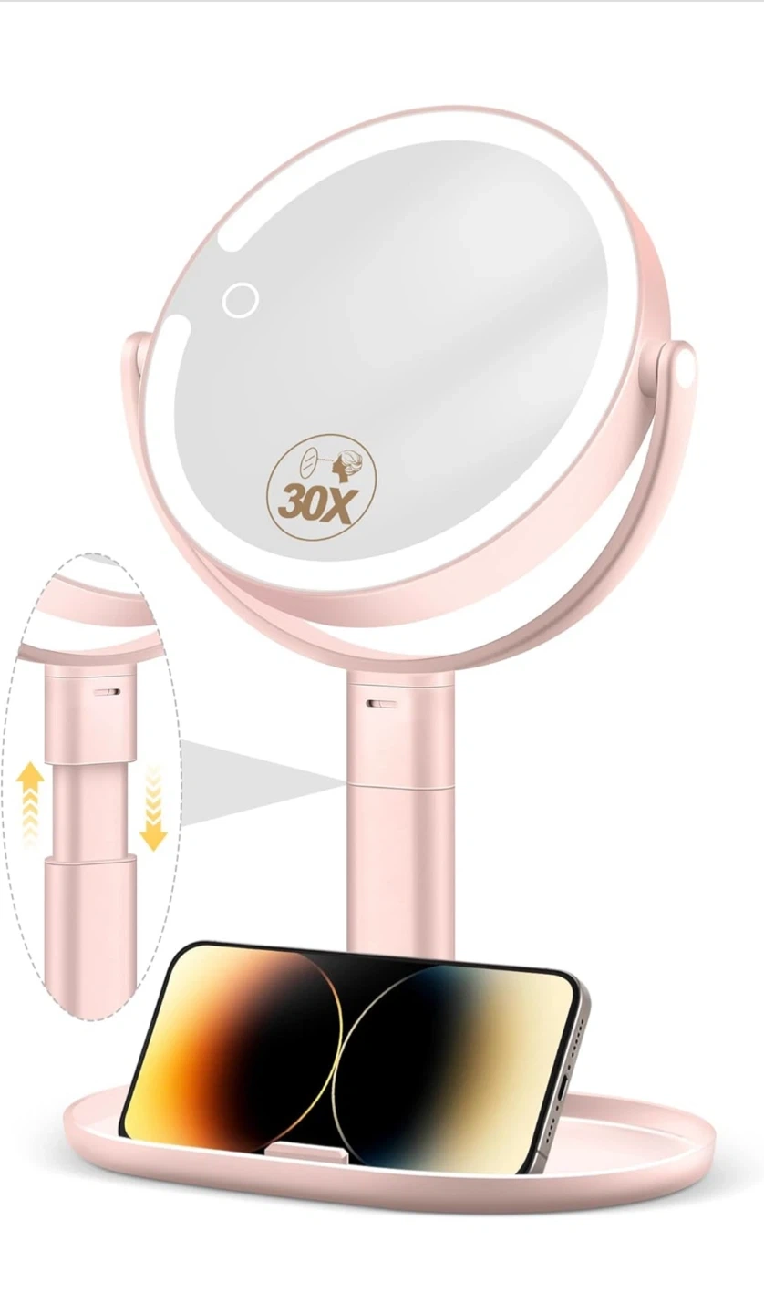 This pink LED makeup mirror offers 1X and 30X magnification options. It features 3 color lights (cold, natural, warm) and adjustable brightness with 64 high-efficiency LEDs. The rechargeable 3000 mAh battery provides 6-12 days of use after a 3-5 hour charge. Includes a USB Type-C charging cable. Great for detailed makeup application!