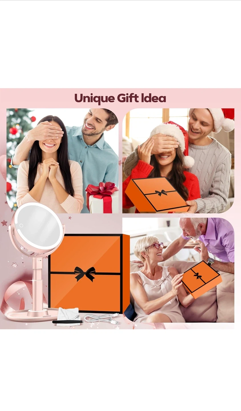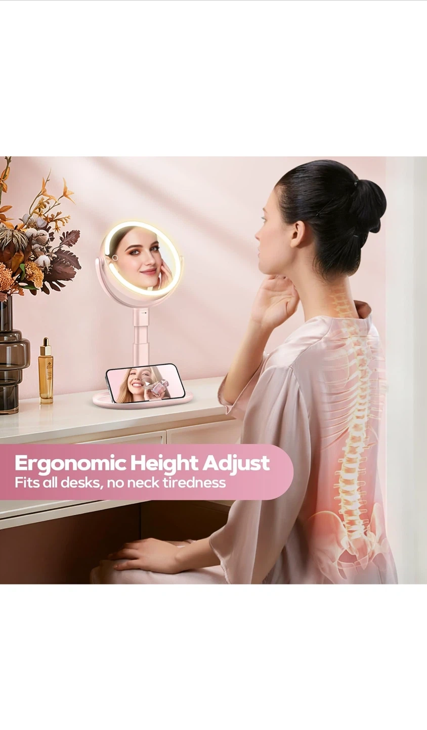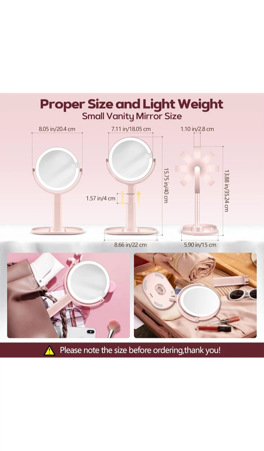 This pink LED makeup mirror offers 1X and 30X magnification options. It features 3 color lights (cold, natural, warm) and adjustable brightness with 64 high-efficiency LEDs. The rechargeable 3000 mAh battery provides 6-12 days of use after a 3-5 hour charge. Includes a USB Type-C charging cable. Great for detailed makeup application!