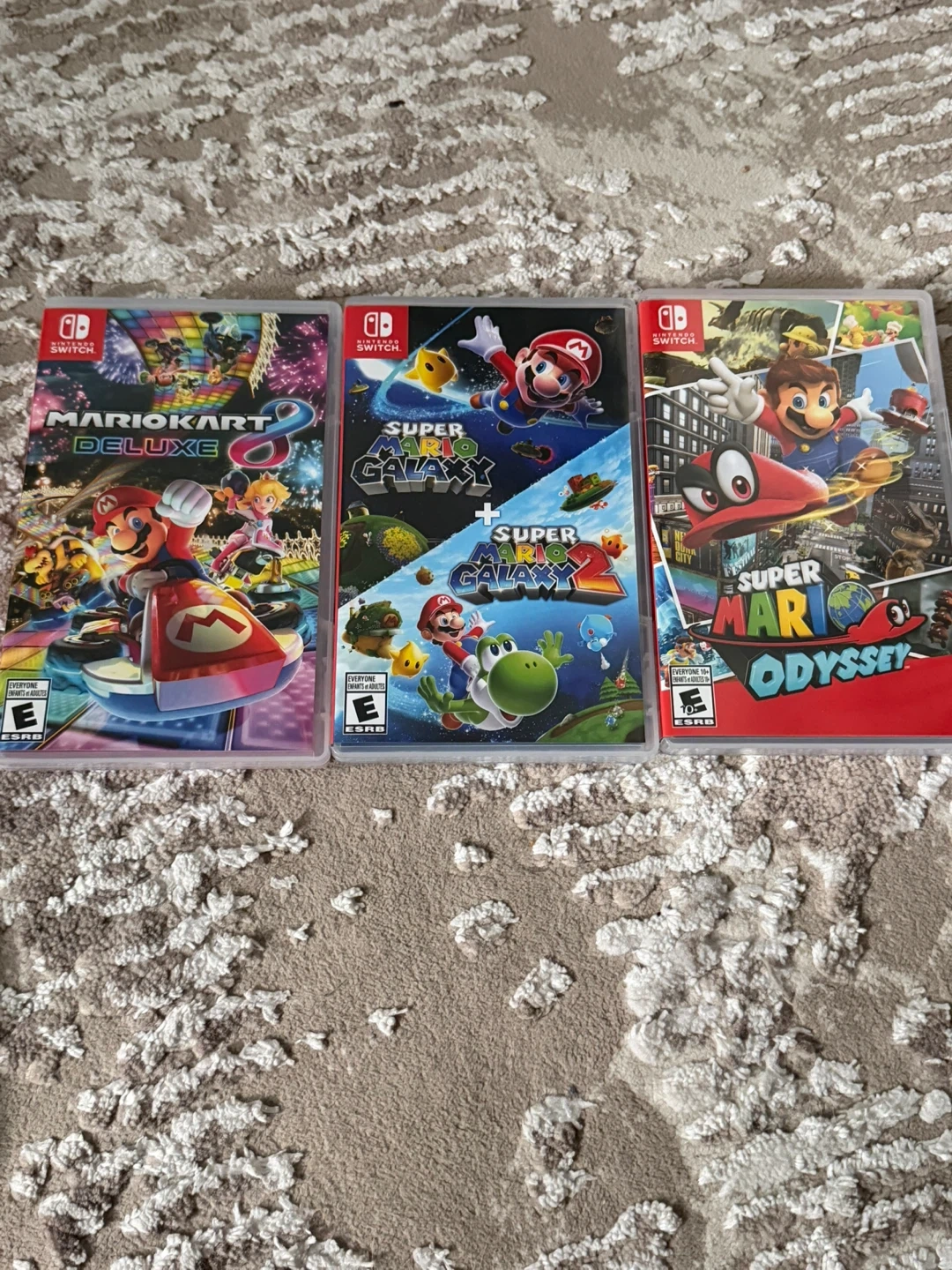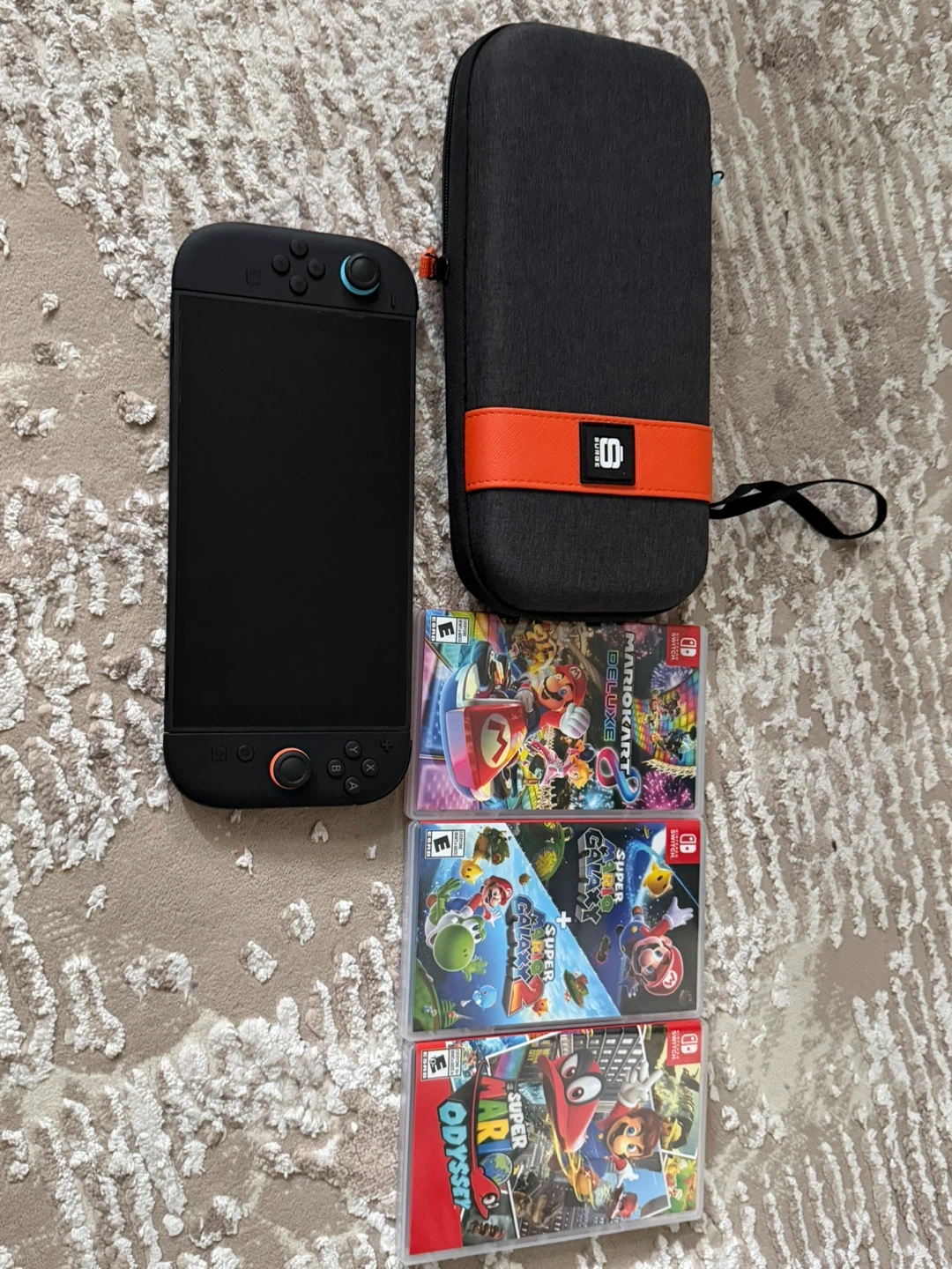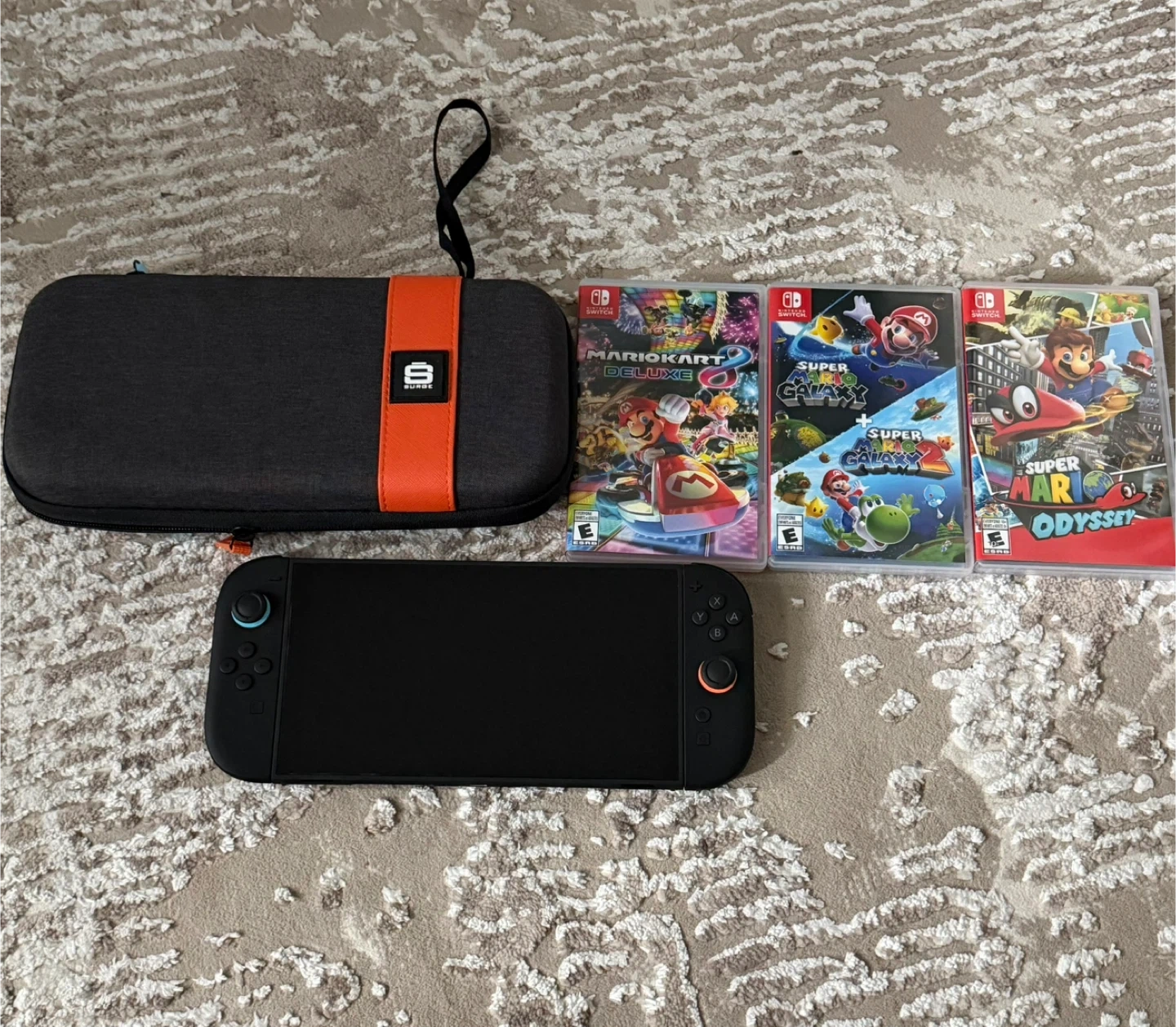 Comes with the Nintendo Switch console, four games: Mario Kart 8 Deluxe, Super Mario Galaxy 1 & 2, and Super Mario Odyssey, plus a black carrying case. It’s in great condition, only used a few times since i bought it. i’m busy with work and don’t ever get time to play