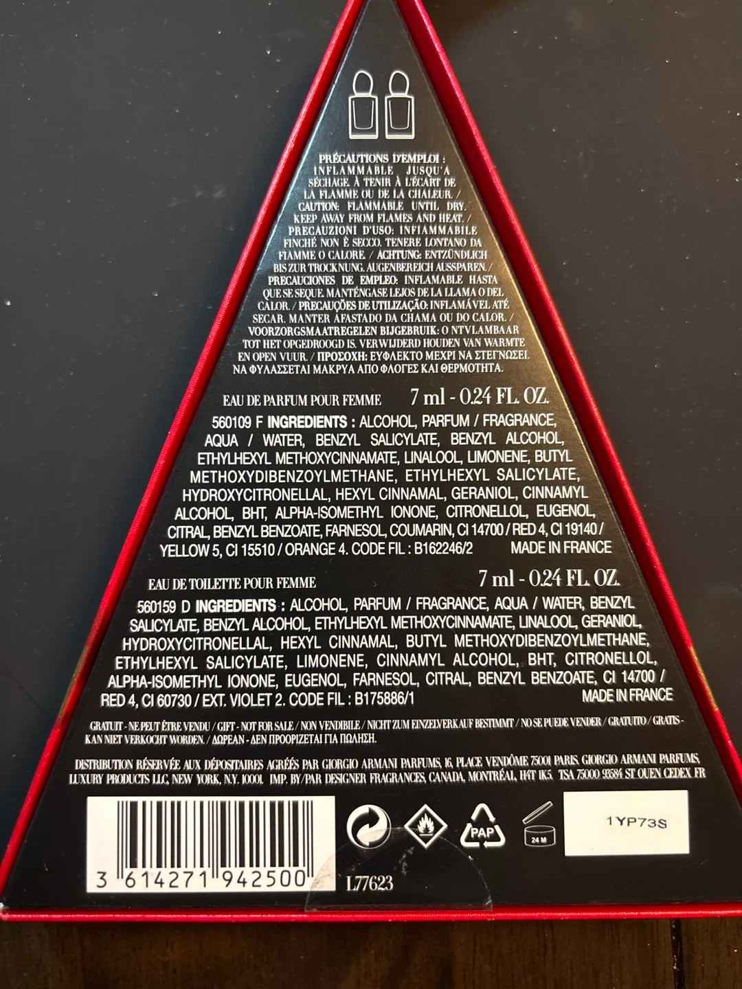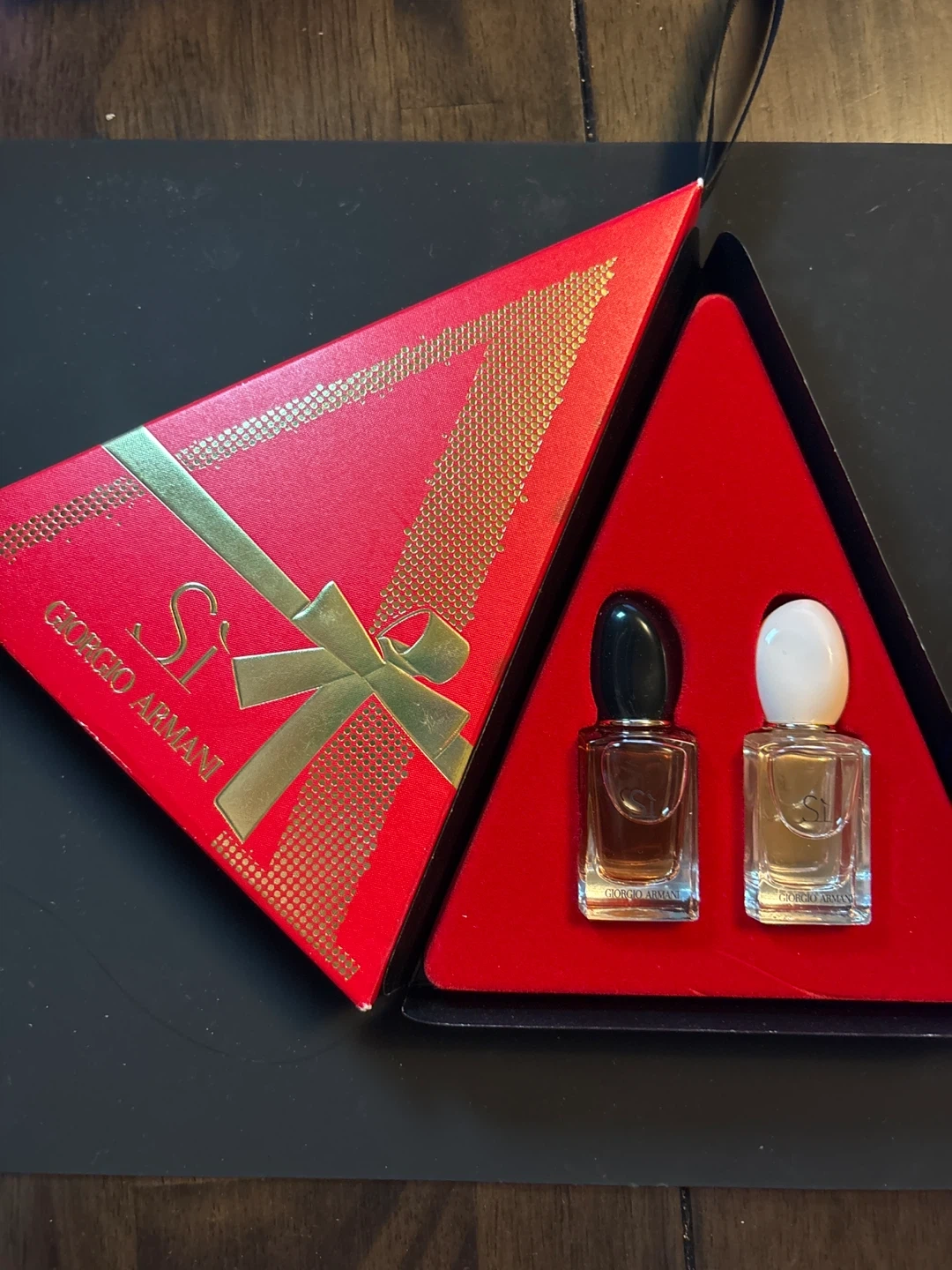 This set features two miniature fragrances from Giorgio Armani, Si Eau de Parfum and Si Eau de Toilette. Each bottle contains 7 ml / 0.24 fl. oz. of perfume. They're presented in a festive red gift box.