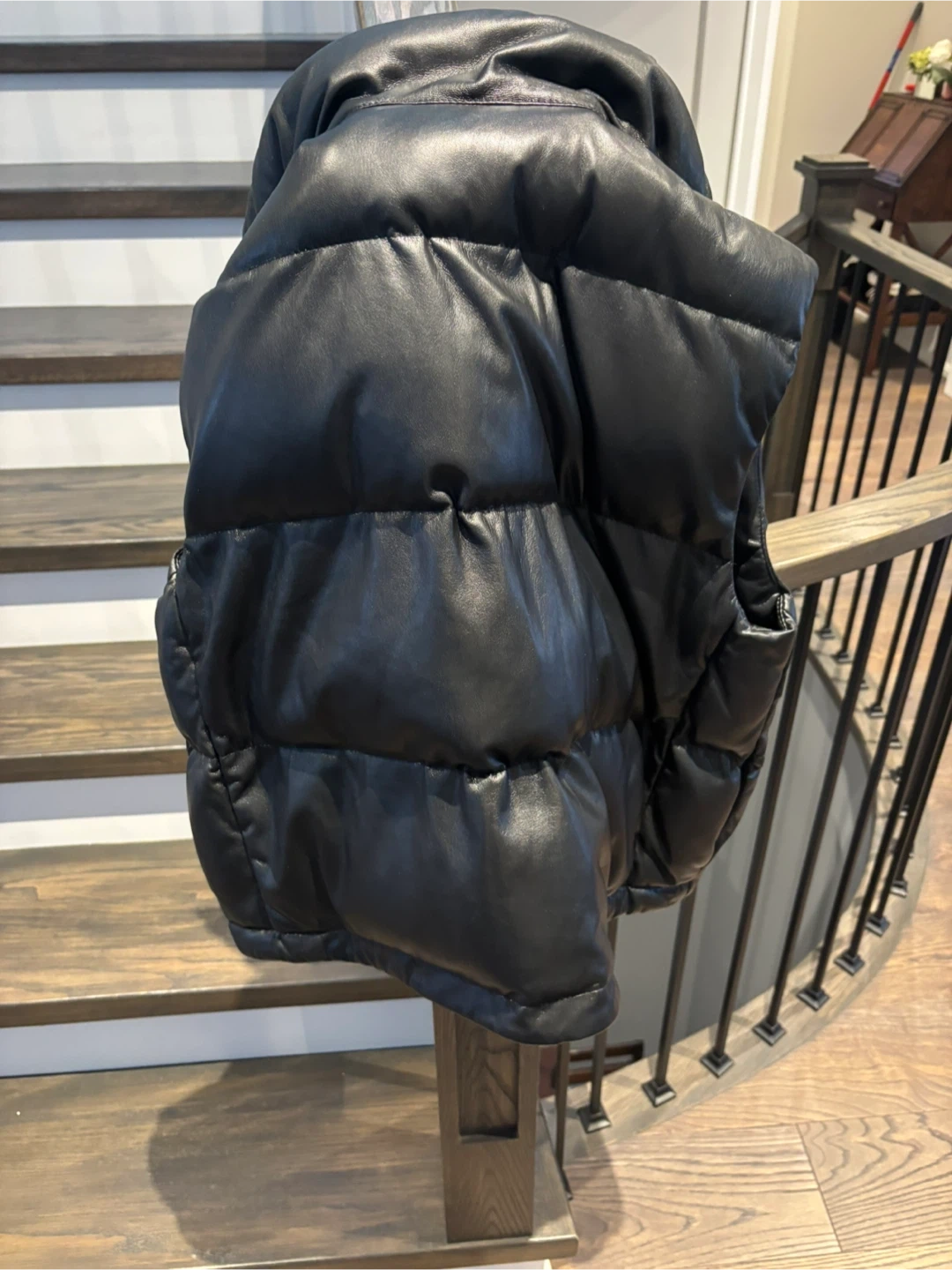 Selling a gently used Aritzia vegan leather puffer vest in black. It's in great condition and perfect for layering during the cooler months. A stylish and comfortable addition to any wardrobe!